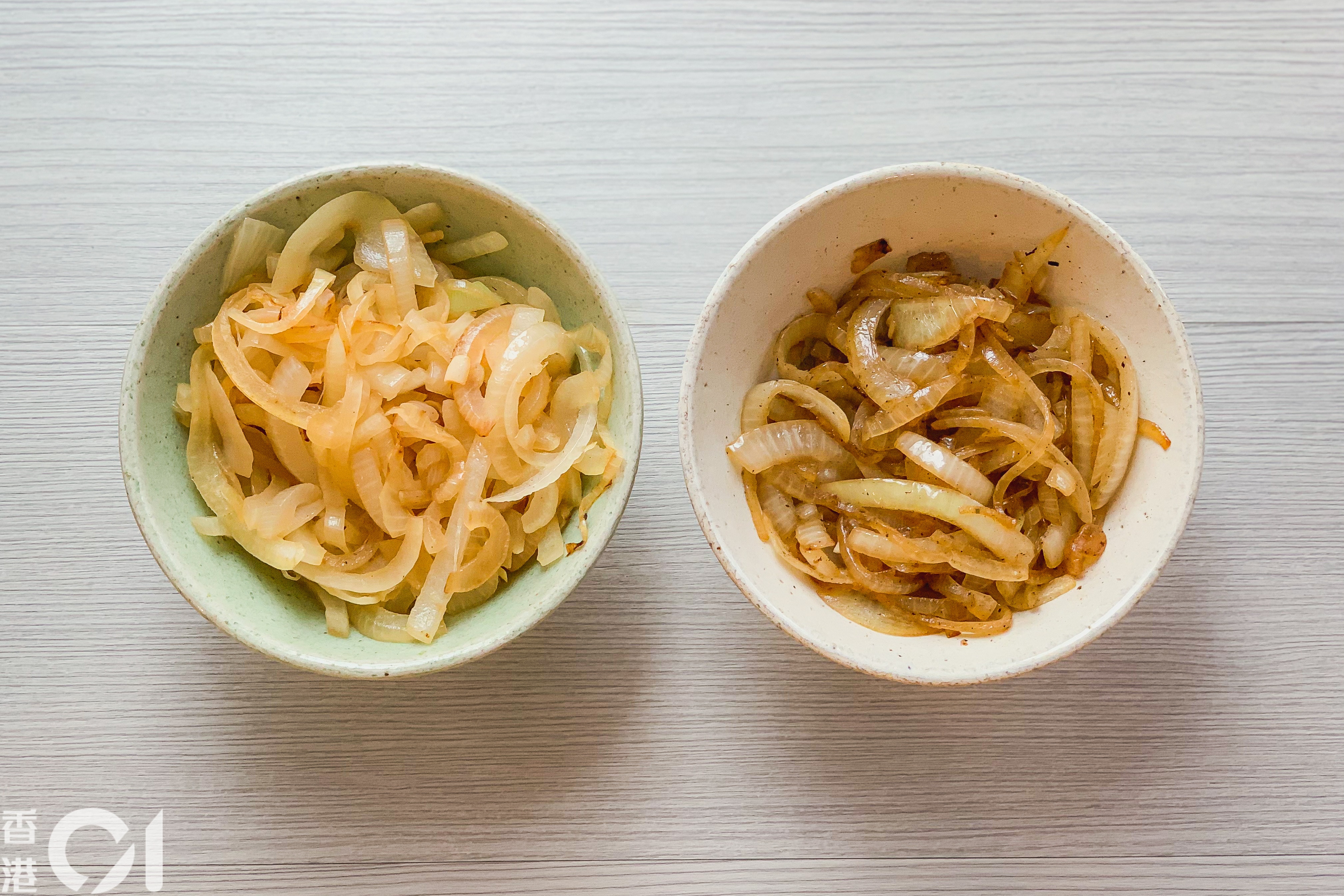比較2碗洋蔥,同樣用3分鐘大火炒,右面用「聰明的方法」炒洋蔥,出焦糖的程度非常快速。