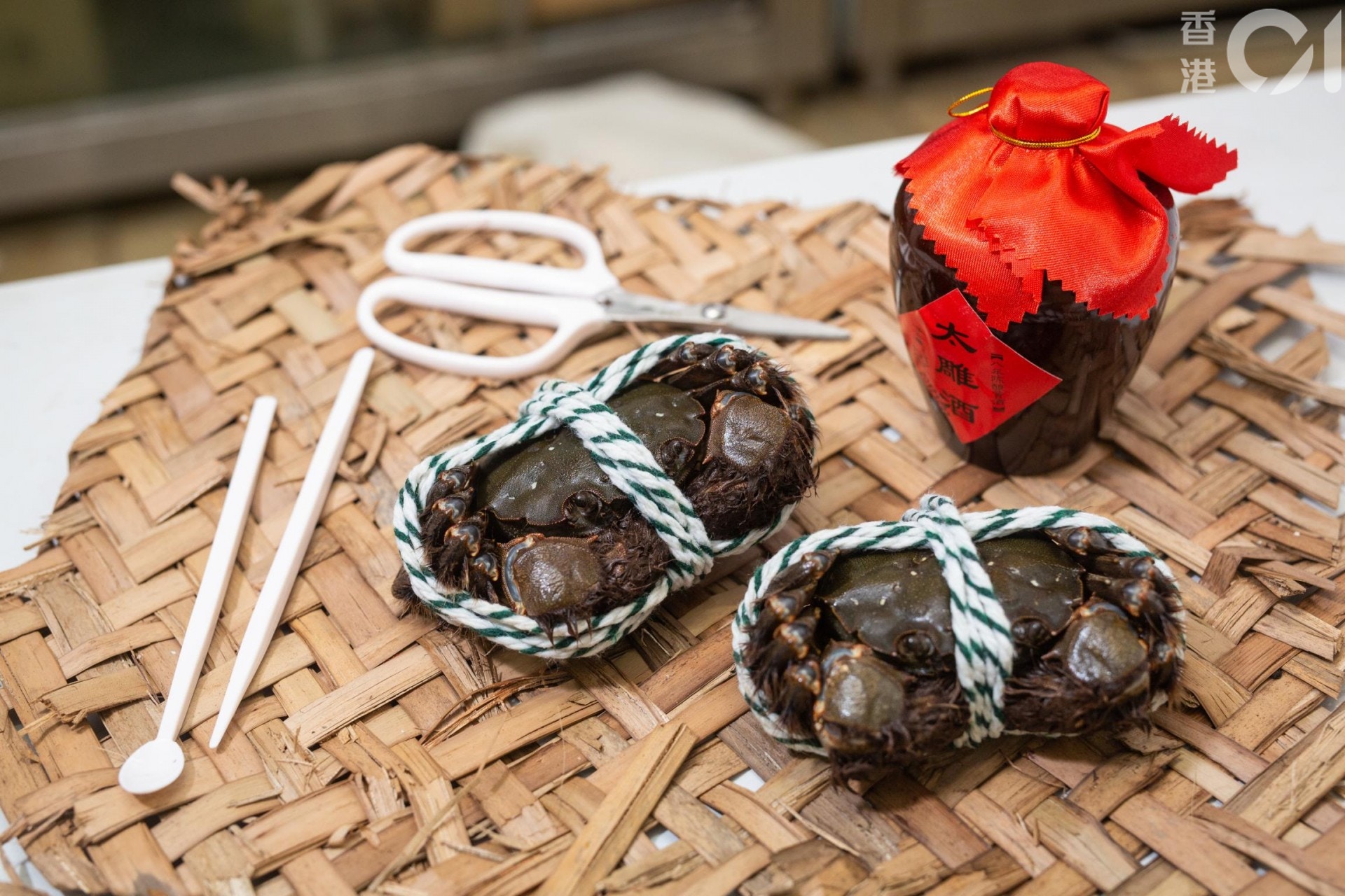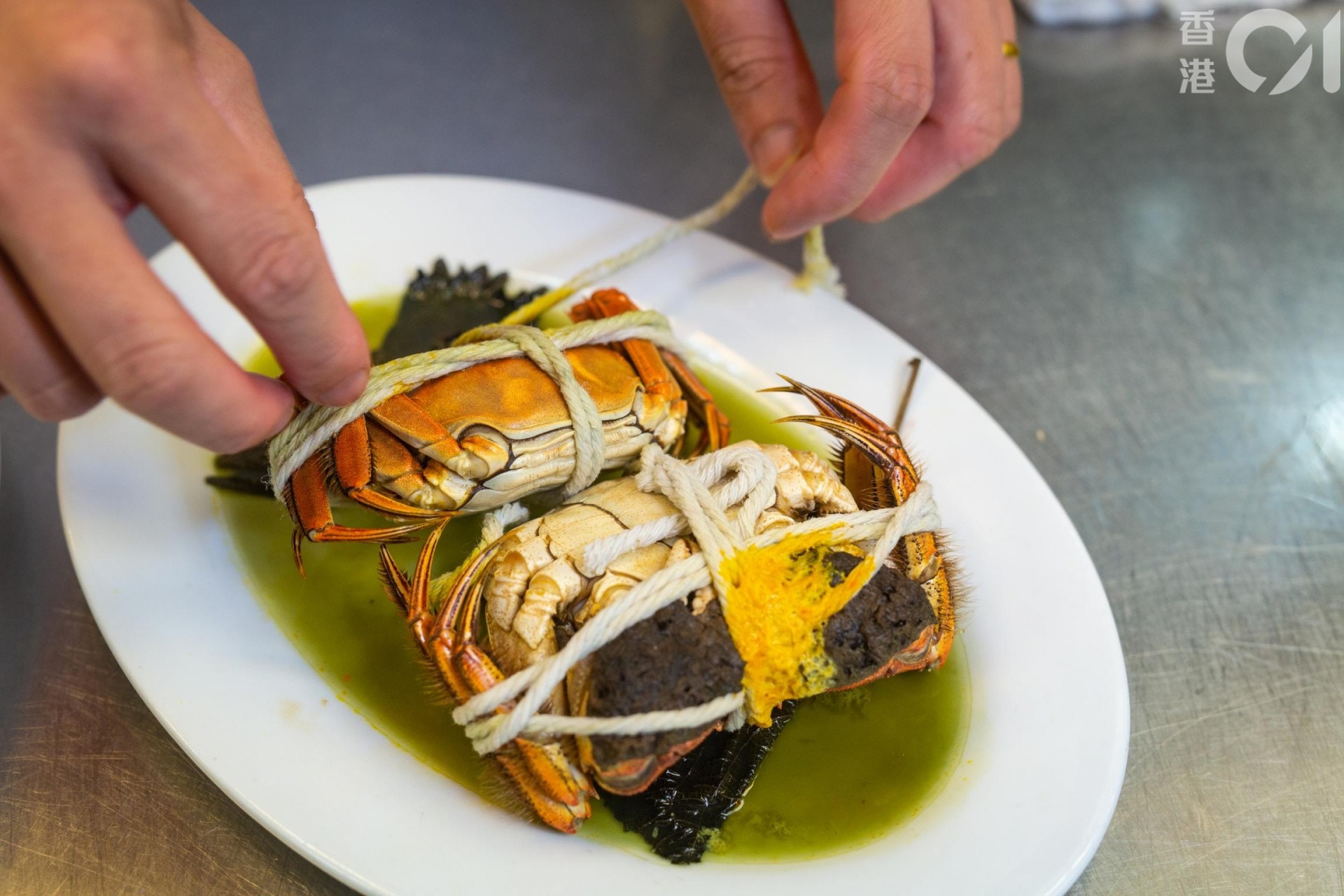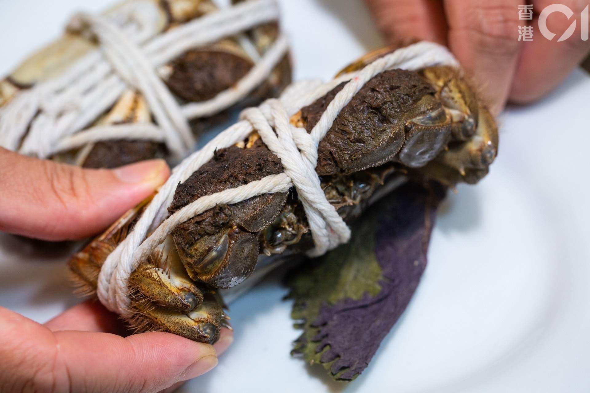 解走綁住大閘蟹的繩,其實不必用剪刀,通常蟹商綁蟹時不會打死結,所以一拉就拉得開。