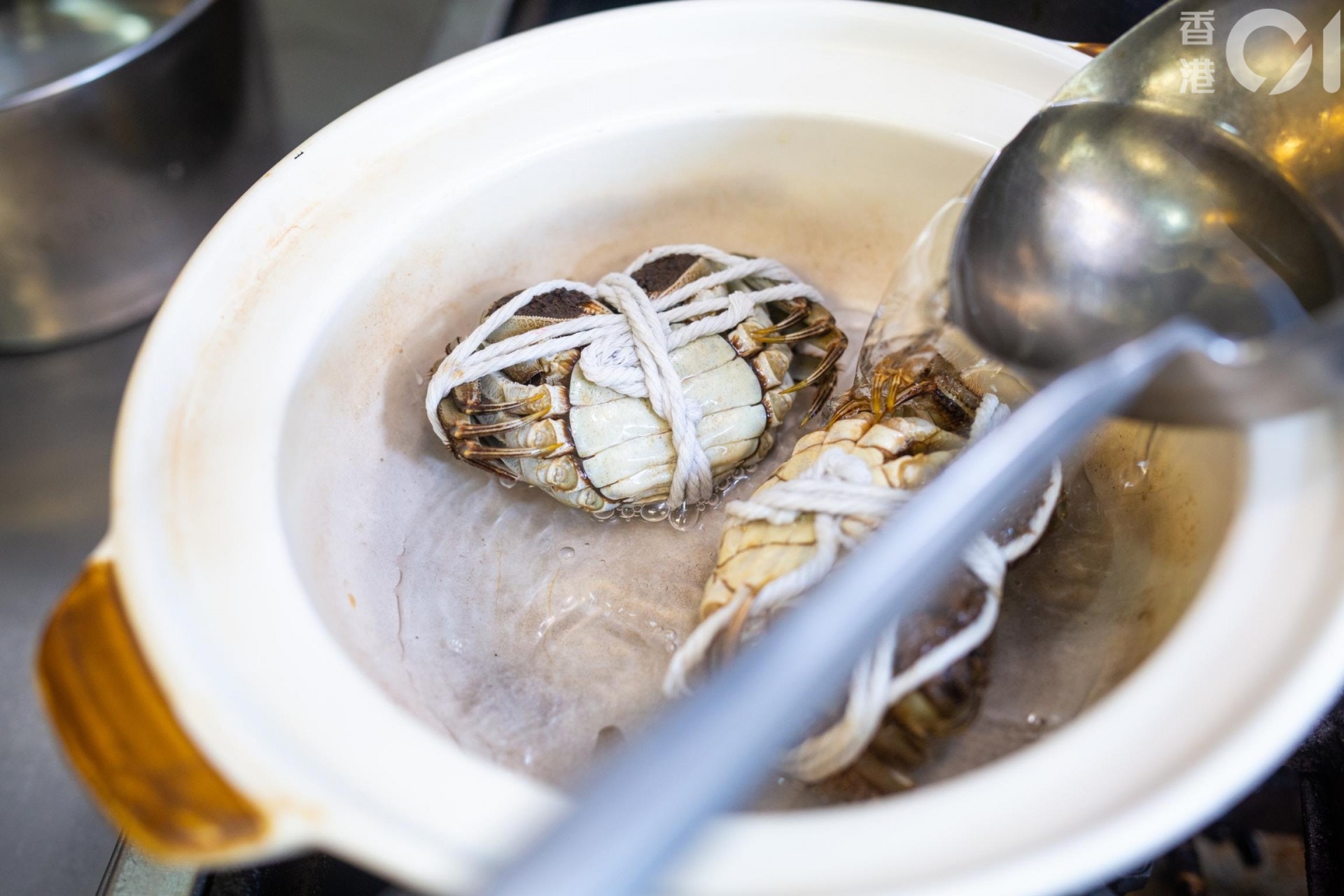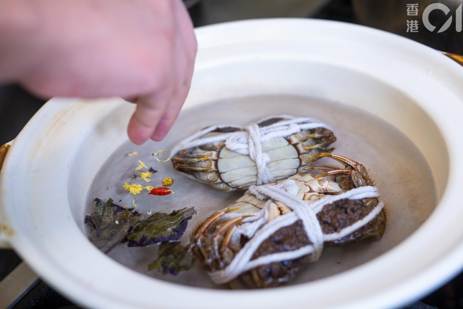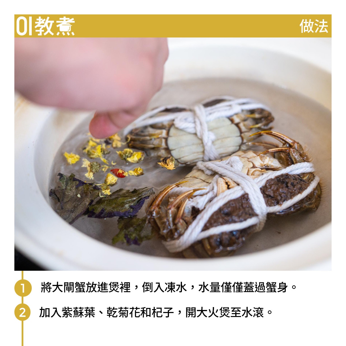 第1步:鍋裡放完蟹再加凍水,水量僅僅蓋過蟹身。見師傅用瓦煲做示範,但他就說這並非必須,家裡隨便找個煲已經可以。