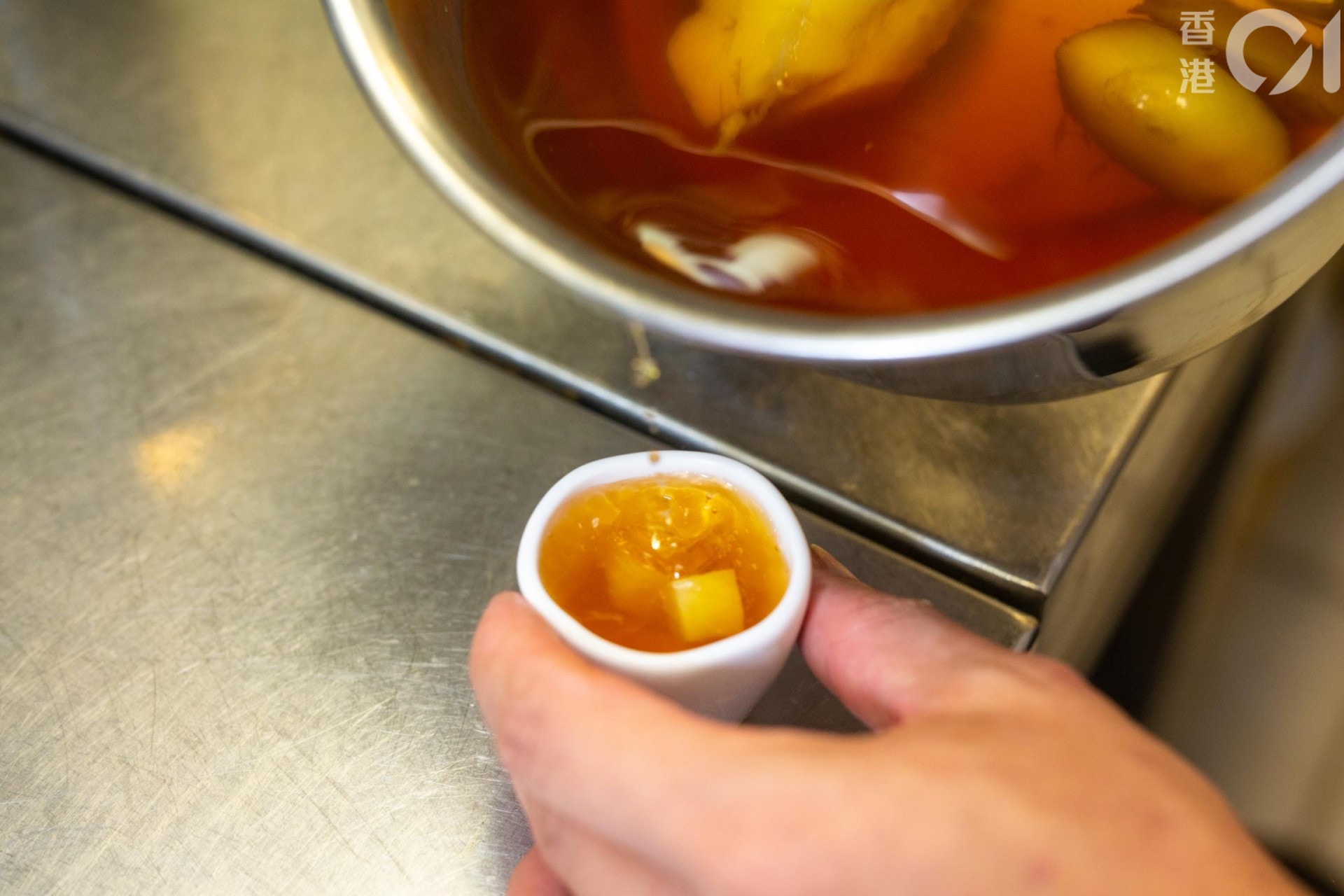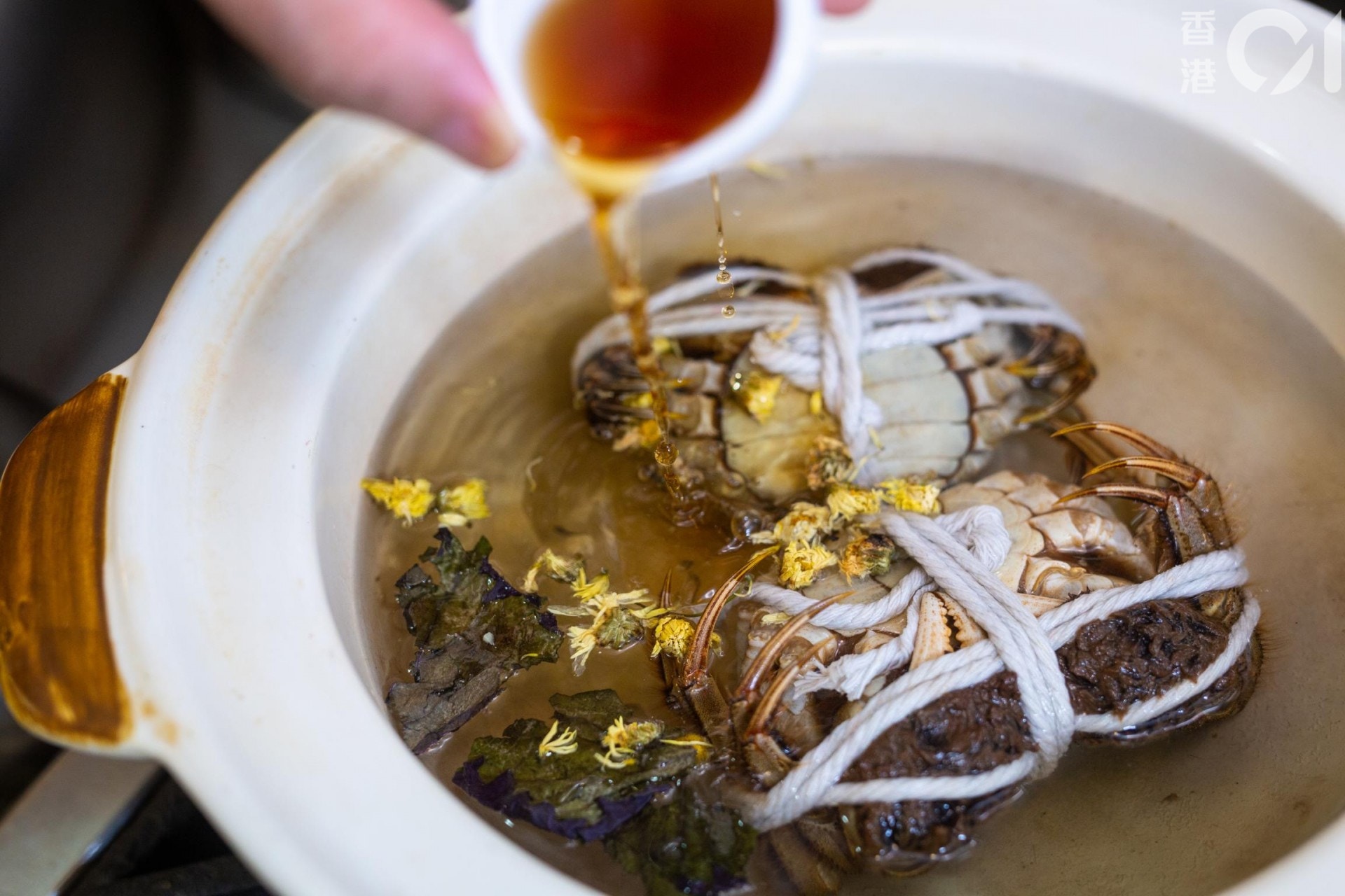 除了蘸醋外,大部分人食大閘蟹都會以薑茶作結,聽到薑茶你可能會以為它是杯茶,其實不然,「薑茶唔係因為佢有茶葉,係因為茶色,同你煲湯圓個糖水差不多。」
