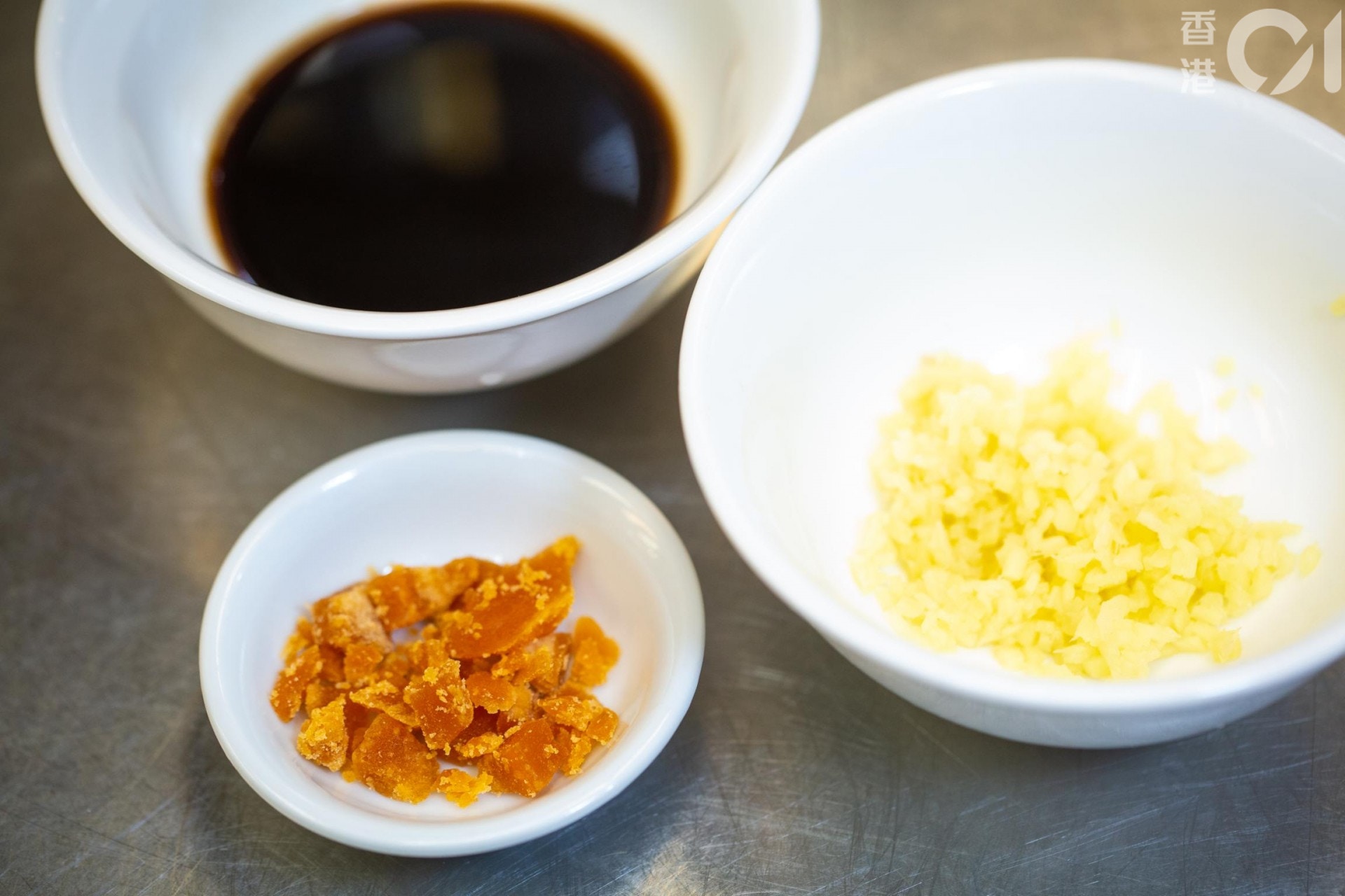 食蟹一定會蘸蟹醋,通常買大閘蟹時店主都會附上蟹醋,但張師傅就會自己製作,左邊的便是他調的蟹醋,通常用1個飯碗鎮江醋再加1/4片片糖,有需要可加少許薑米。