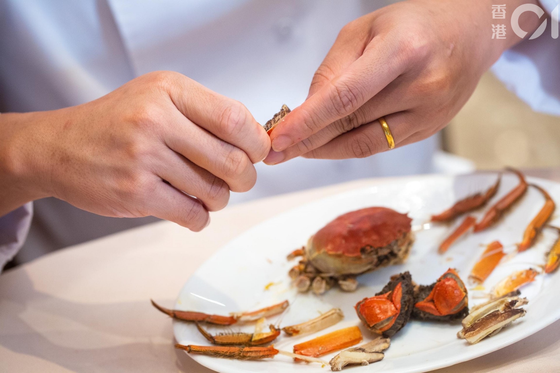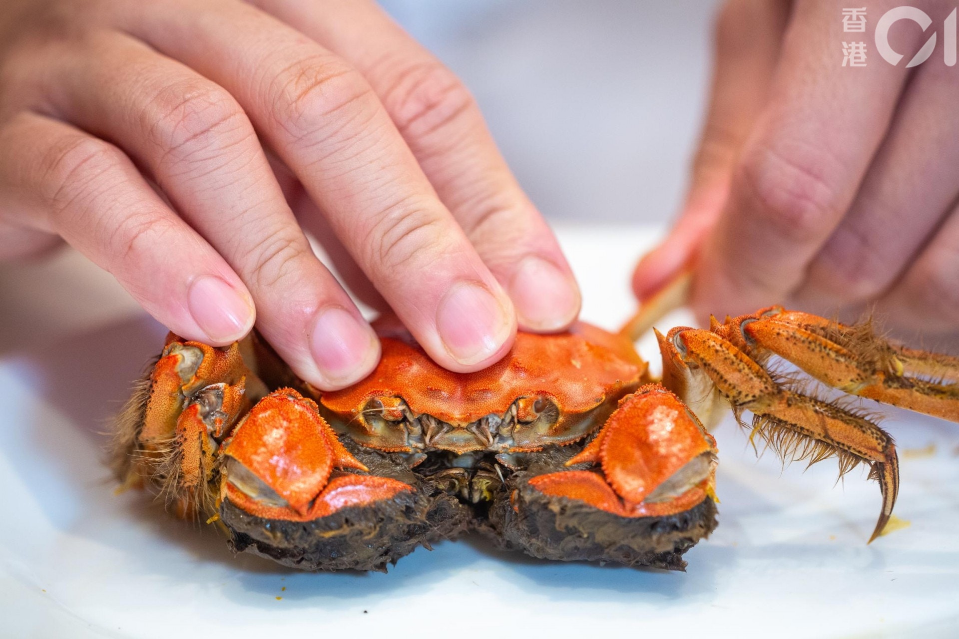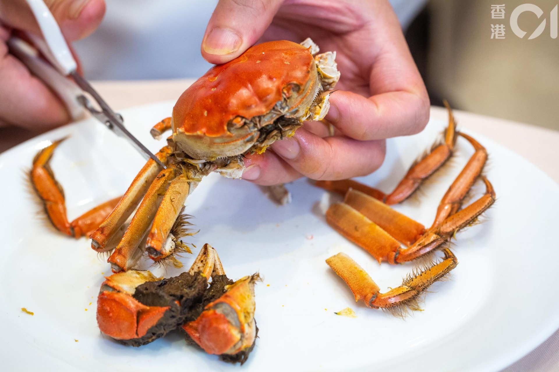 他會拆出蟹腳所有蟹肉再一次過食,然後品嘗蟹蓋上的蟹膏,再來才慢慢吃蟹身。