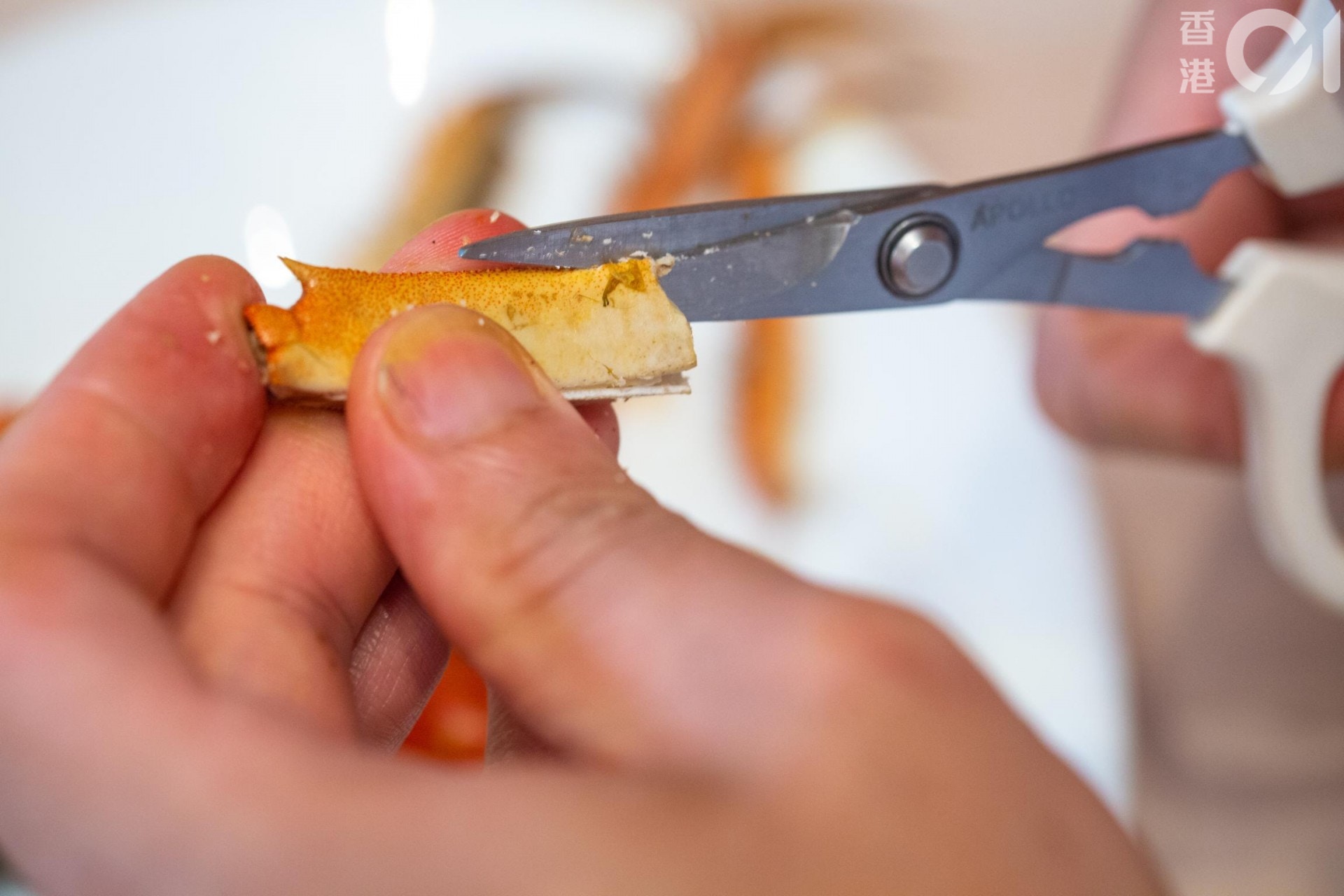 先剪斷蟹腳和蟹鉗,下刀的位置要跟關節位保持少許距離。