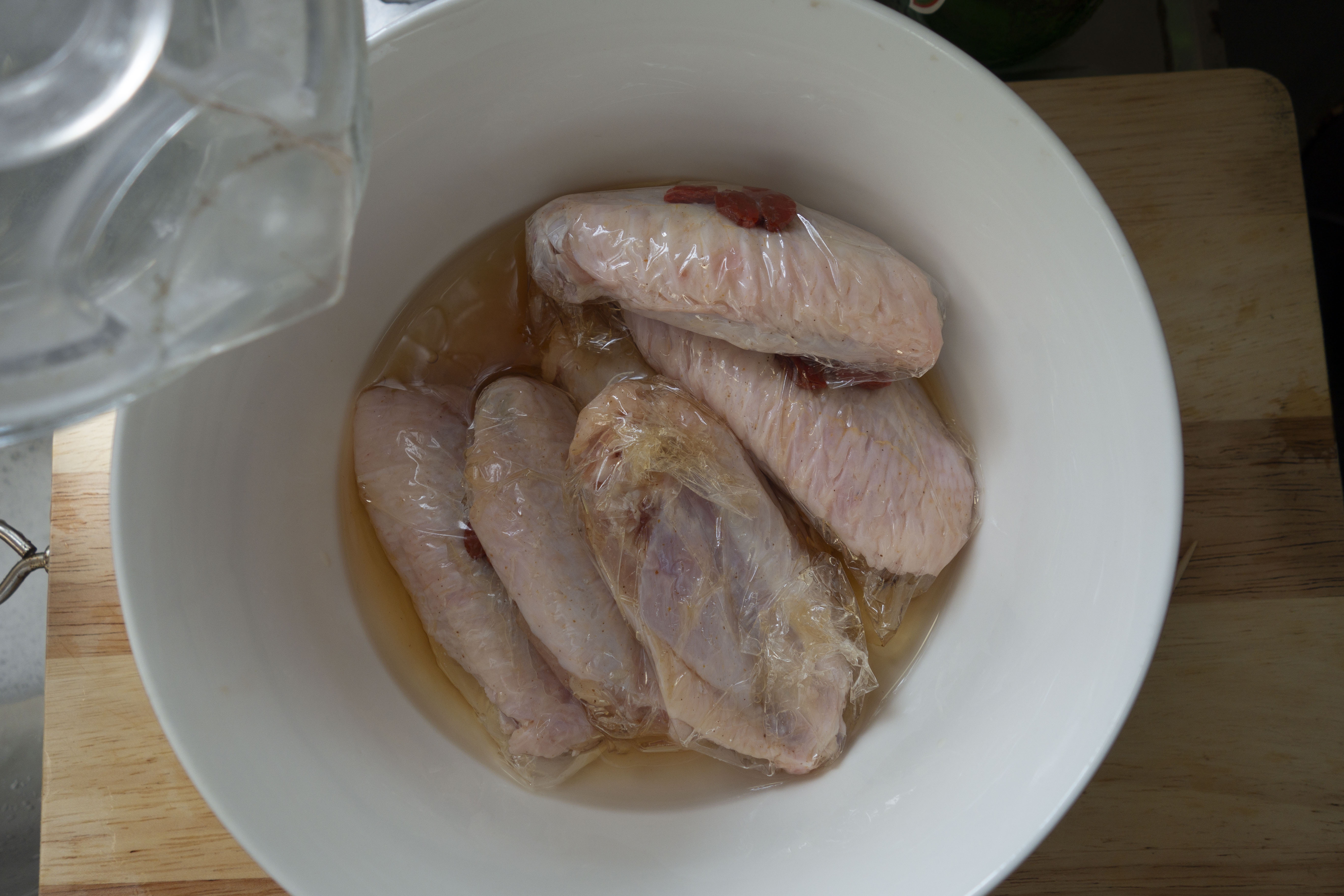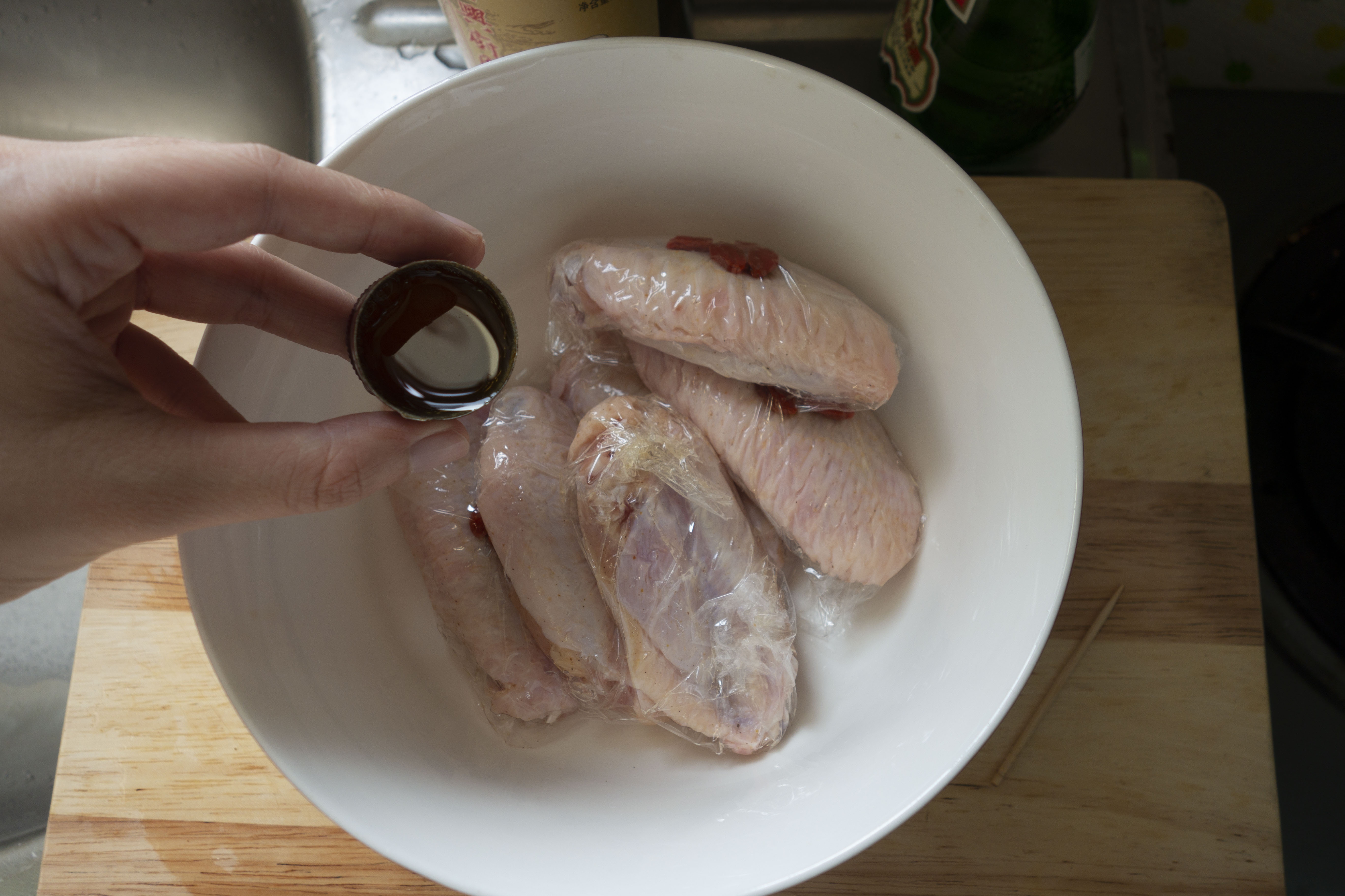 花雕醉雞翼材料:雞翼6隻、花雕酒/紹興酒40毫升、玫瑰露酒1茶匙、胡椒粉1茶匙、鹽1茶匙、生粉1茶匙、水10毫升、麻油2茶匙、杞子適量