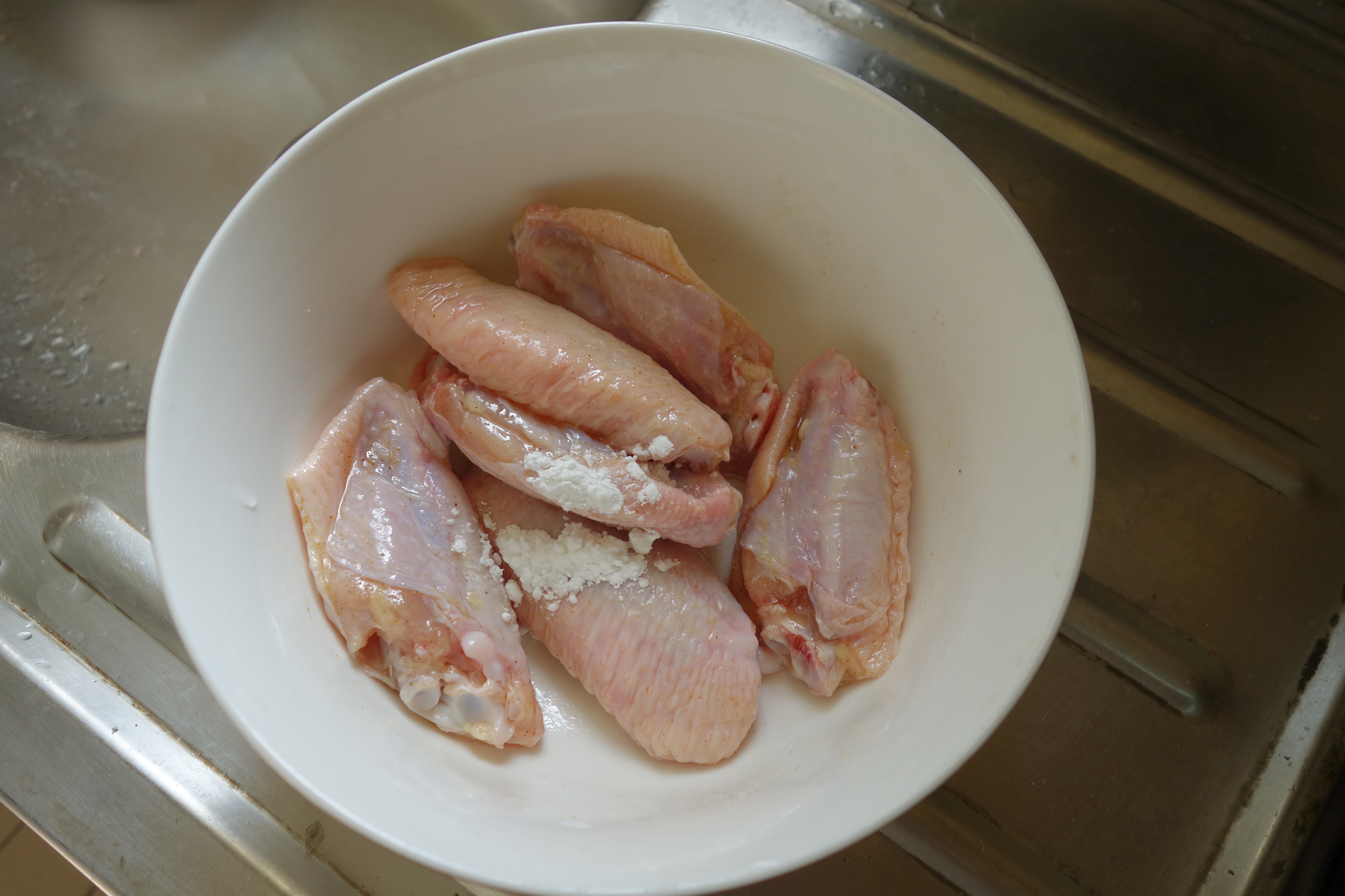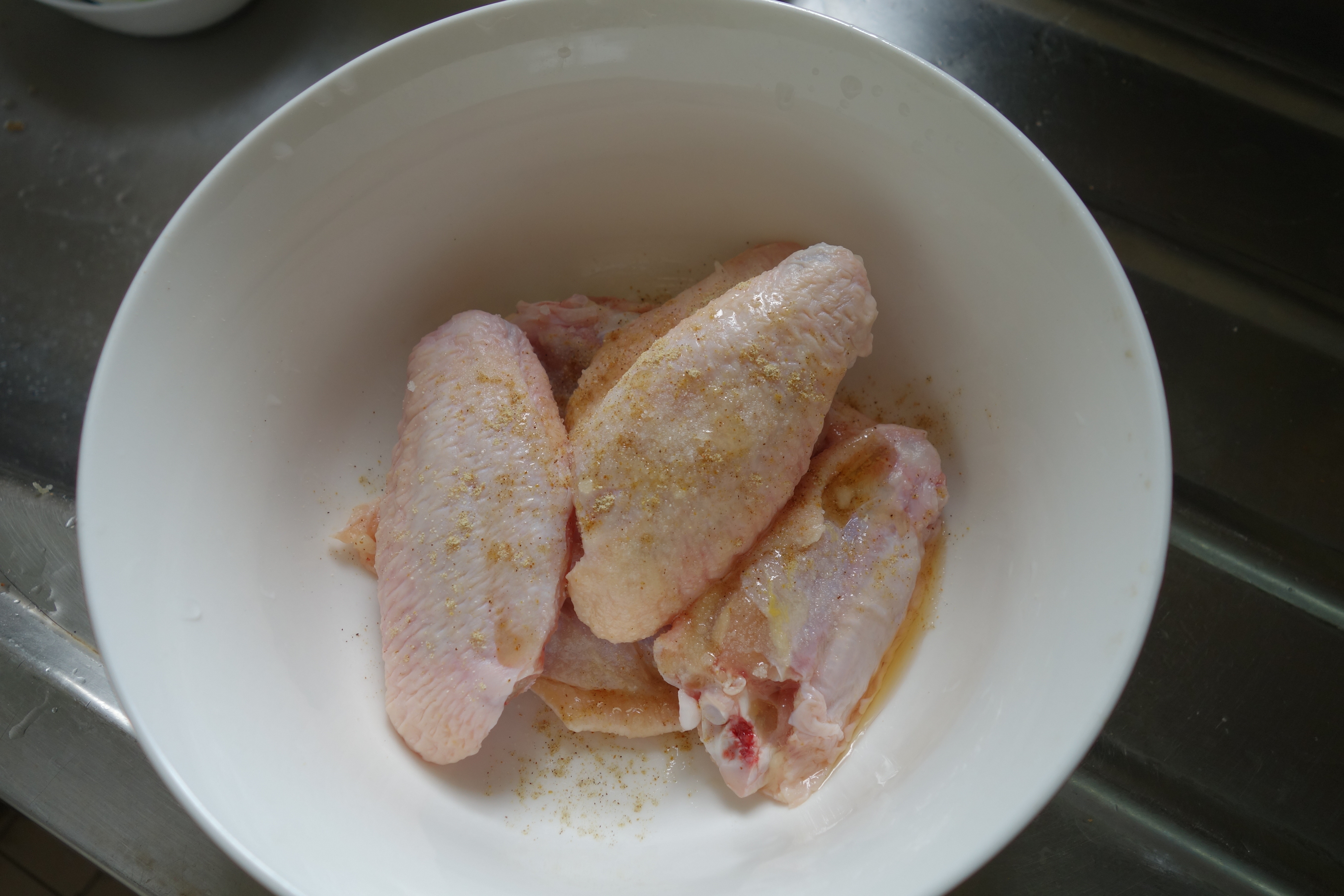 步驟1|用鹽、胡椒粉及麻油將雞翼拌勻。