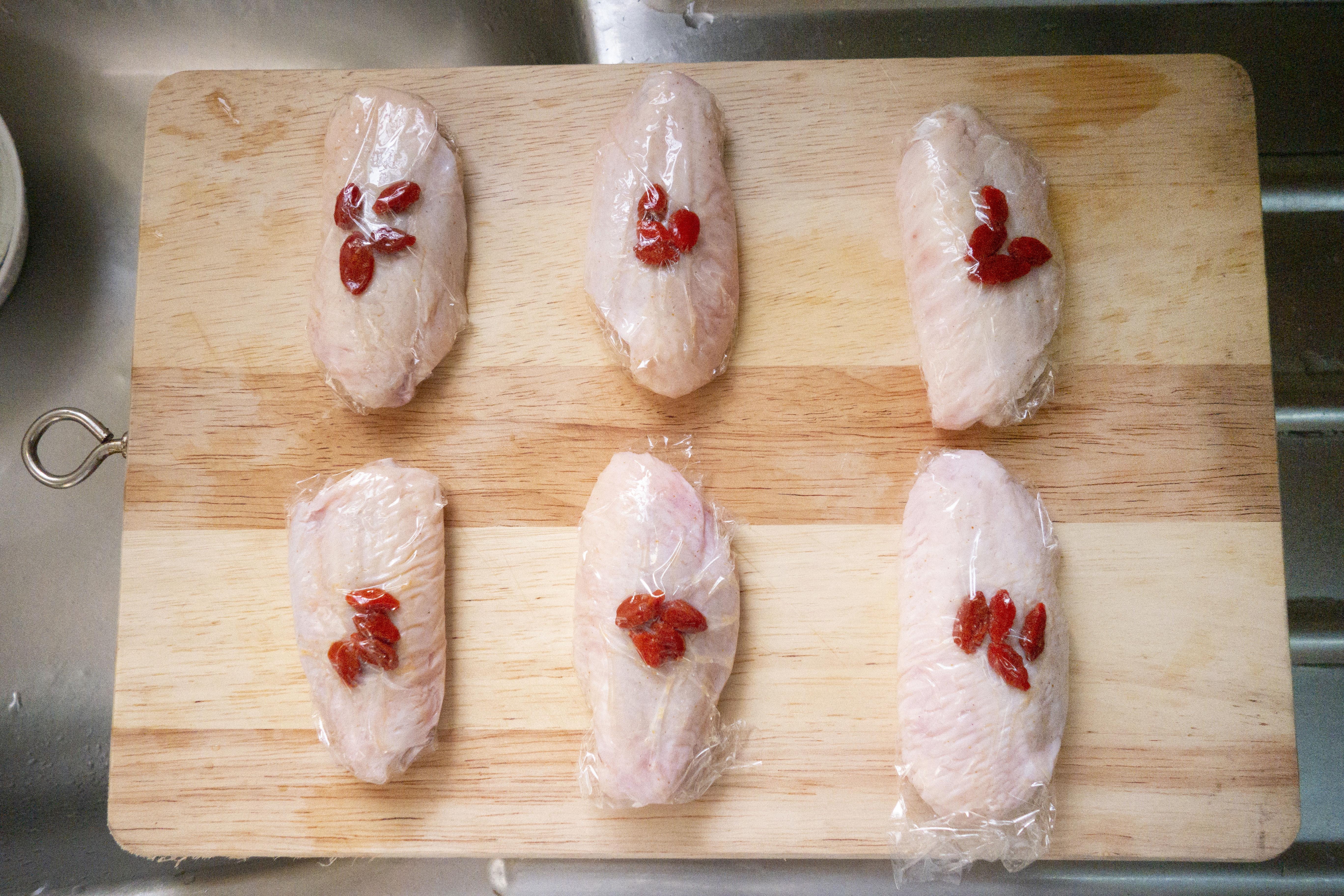 再放上雞翼,把整隻雞翼包裹好。