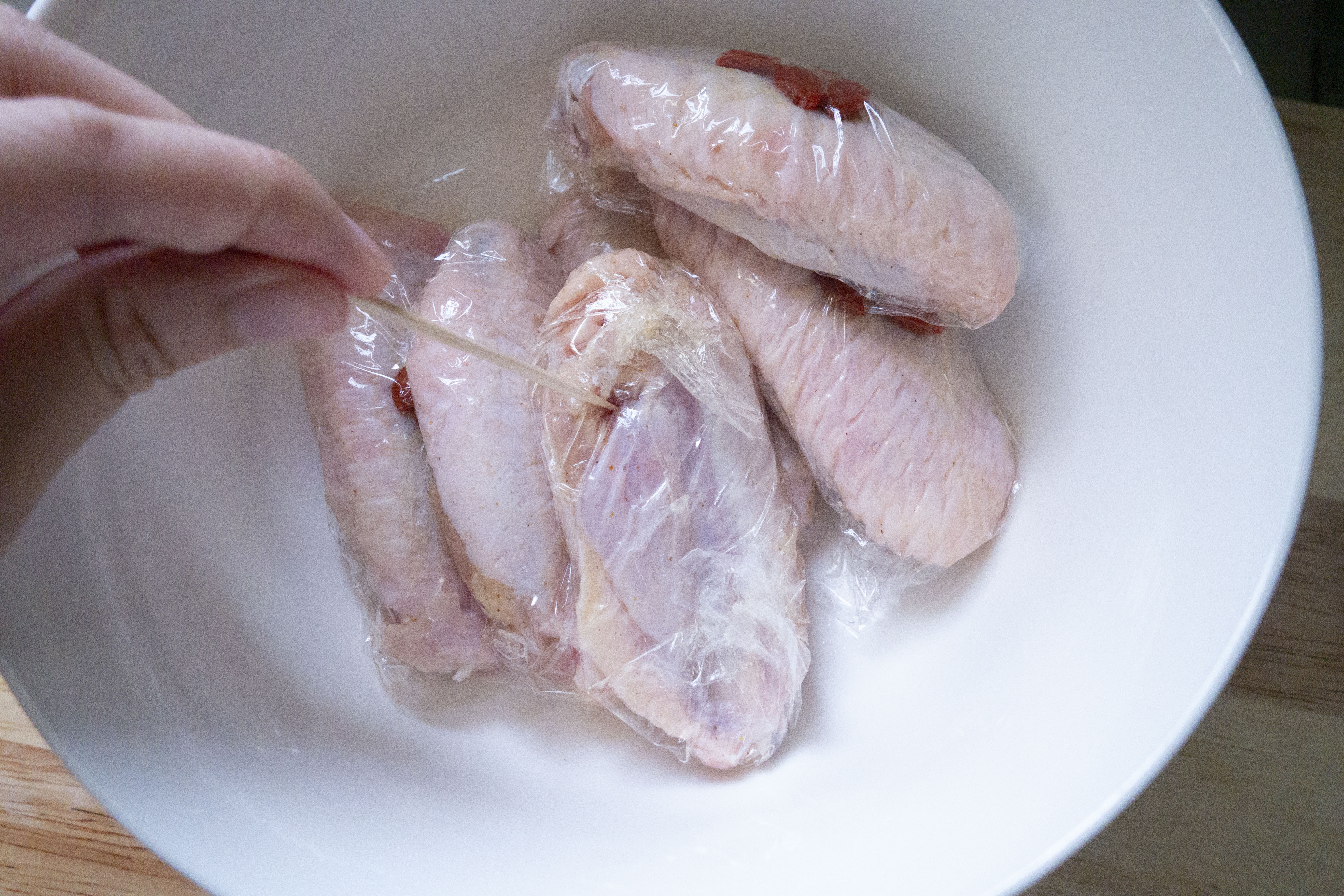 步驟4|用牙籤於雞翼兩面穿插,令微波爐保鮮紙表面有洞。