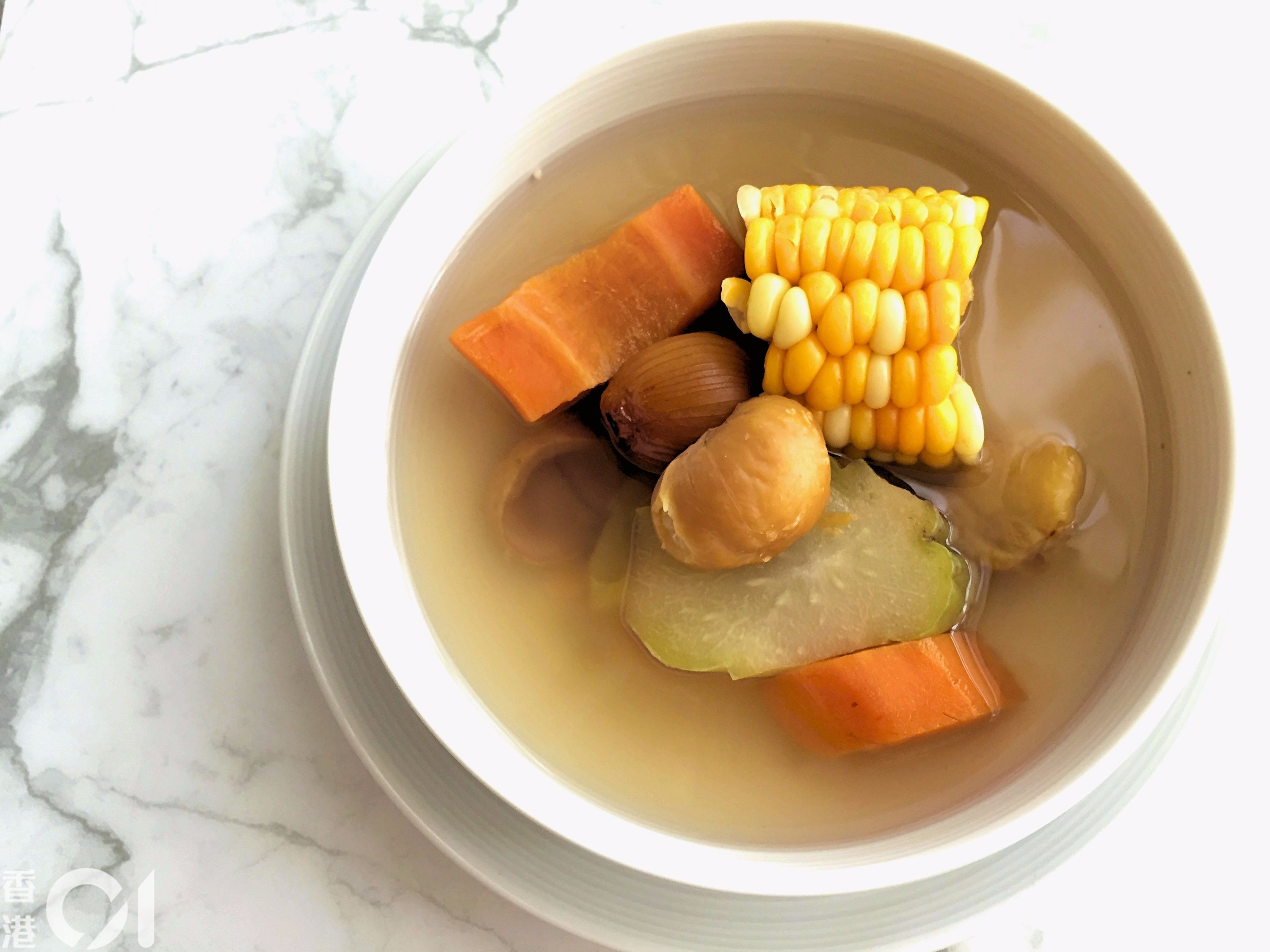 沒有放肉的湯也十分鮮甜,用上栗子、腰果及紅蘿蔔等食材,可以大大提升素湯的鮮甜味。配佛手、粟米及南北杏,中醫師認為此湯能潤燥、健脾、開胃、壯腰、固腎及強腰腿。
