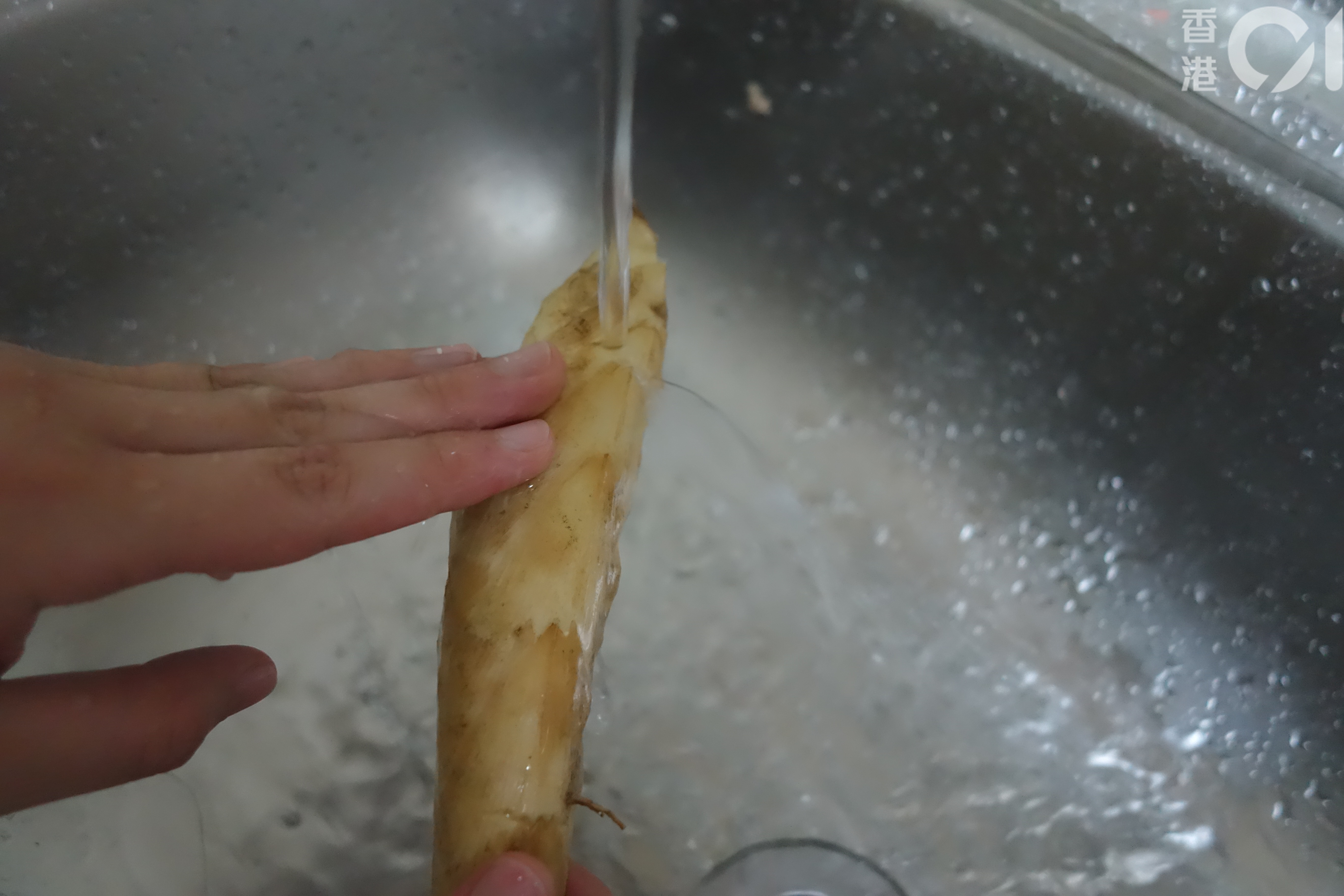 先在流水下把泥垢沖走。