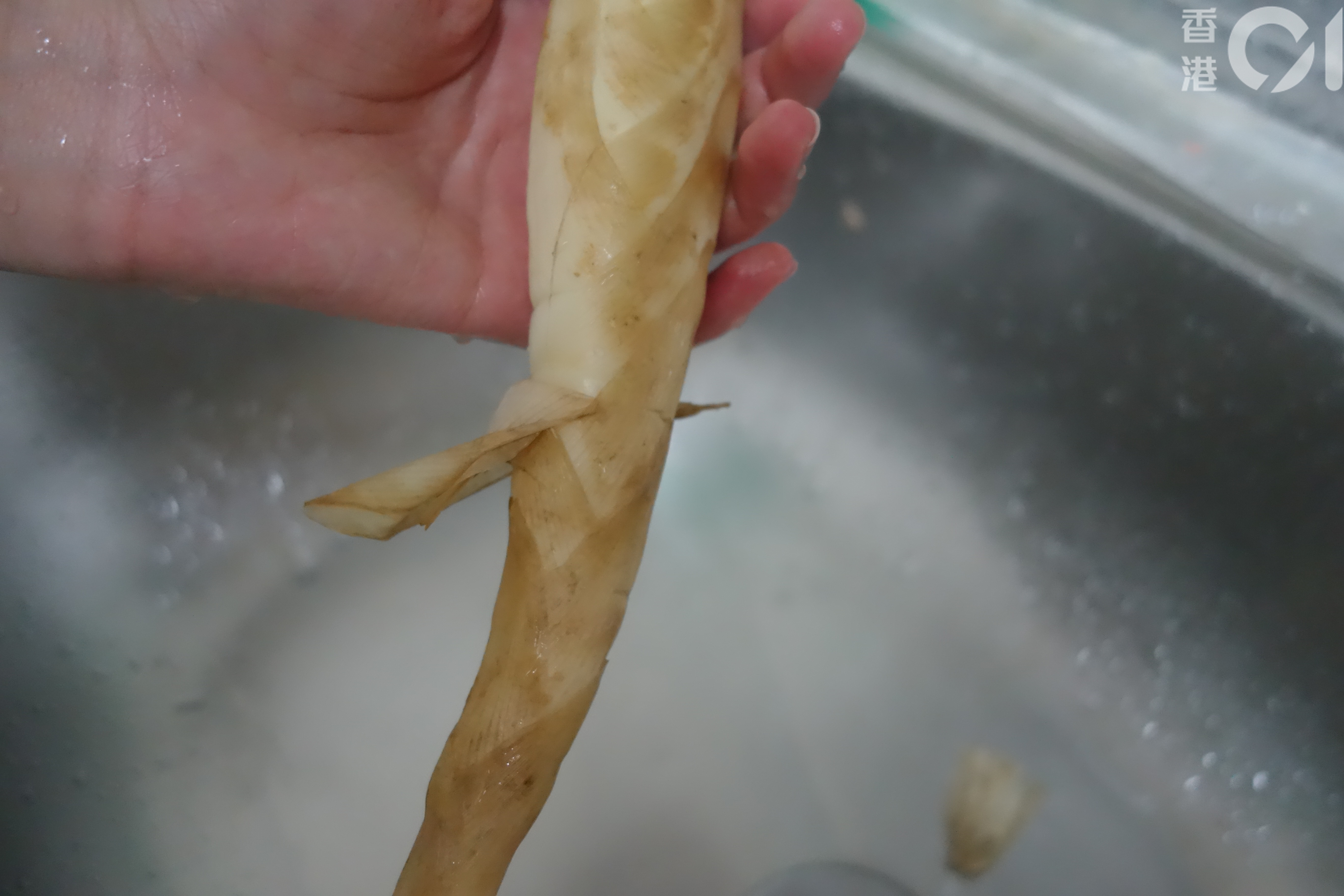 之後把粗身的部分向天,向下撕走竹芋外皮,再沖洗一下便可以烹調來吃。