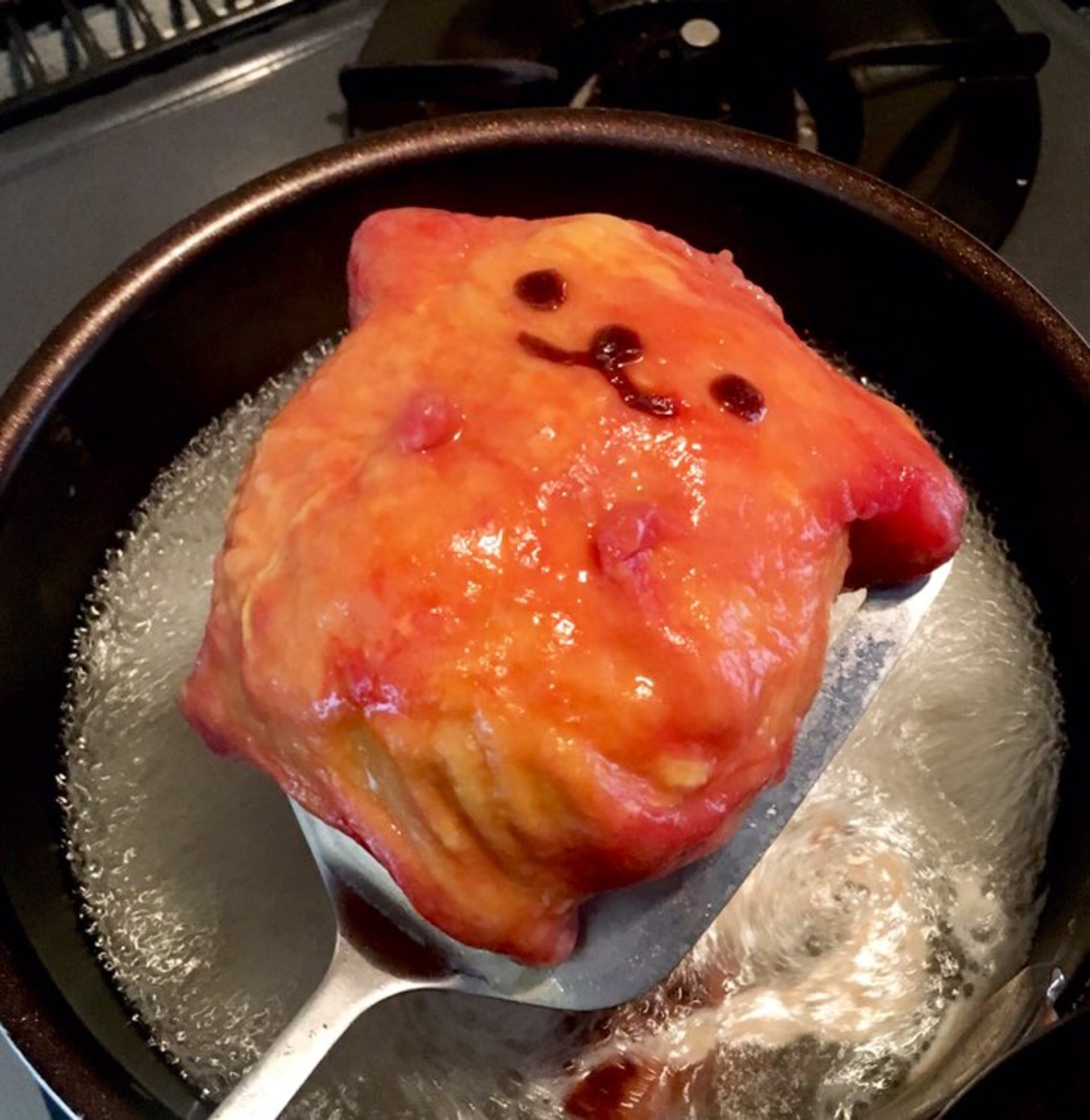 【暗黑料理】布甸狗的「黃色皮」一下鍋後,瞬間變成紅色,就像皮肉被燙傷一樣。(narok___Twitter圖片)
