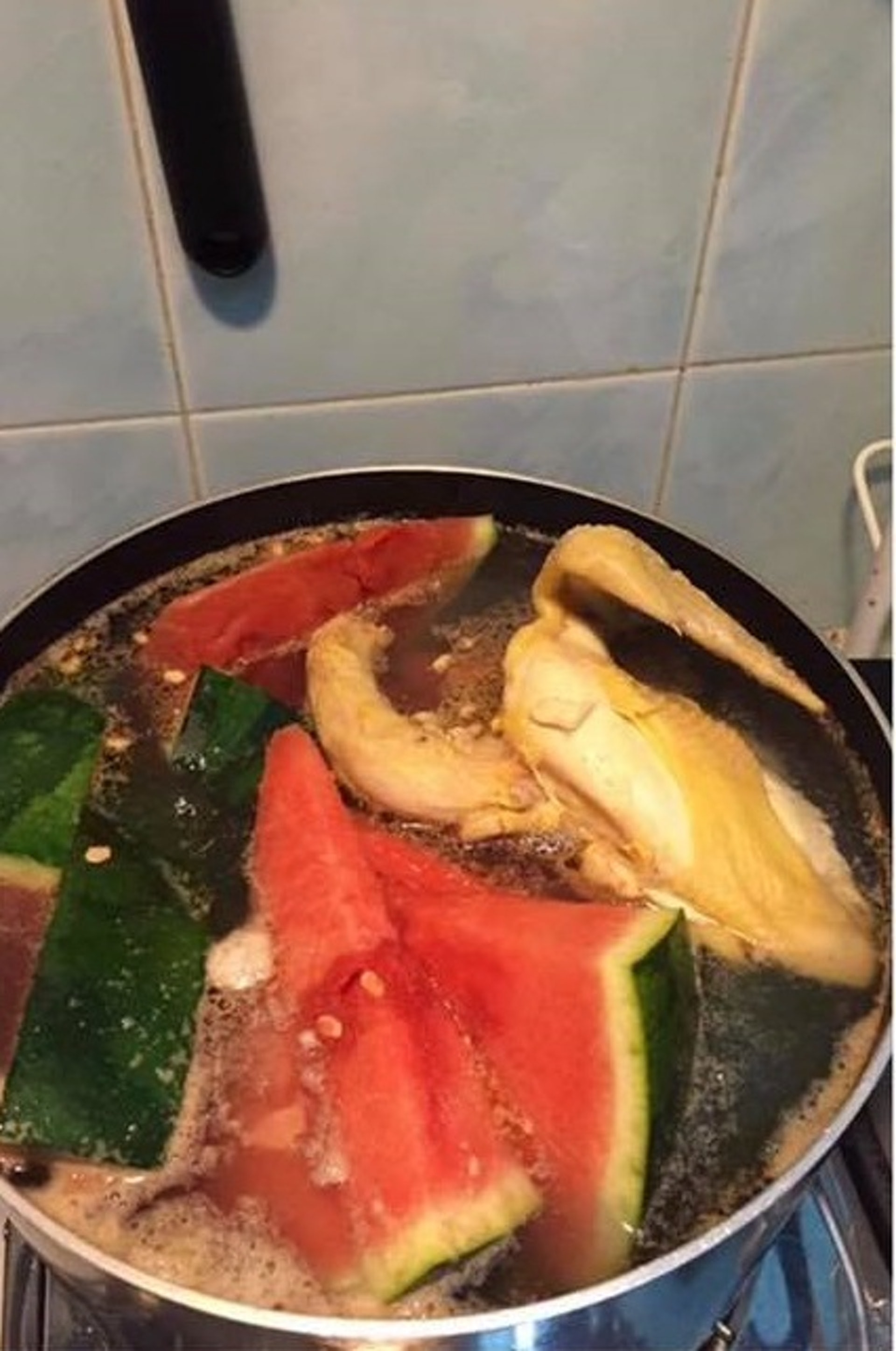 【暗黑料理】網上流傳「西瓜煲雞」,材料有「西瓜半個、雞一隻、南北杏少許、豬展8兩」,烹調方法為「文火煲2小時至金黃色,熄火至晚上加鹽加熱可以飲」,有中醫不禁評價為「地獄食譜」。(巴打絲打FB Club圖片)