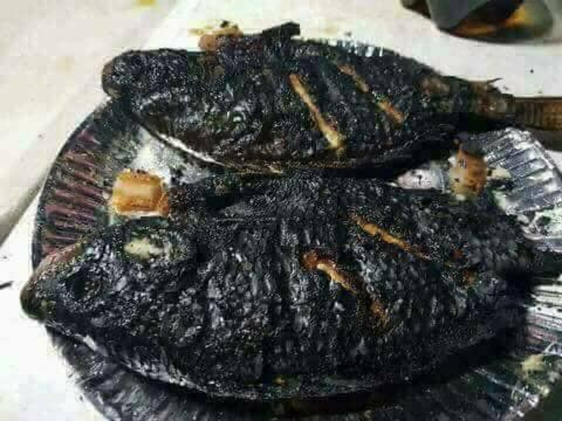 【暗黑料理】兩條因炸焦了而黑到分不清品種的魚。(爆廢公社FB圖片)