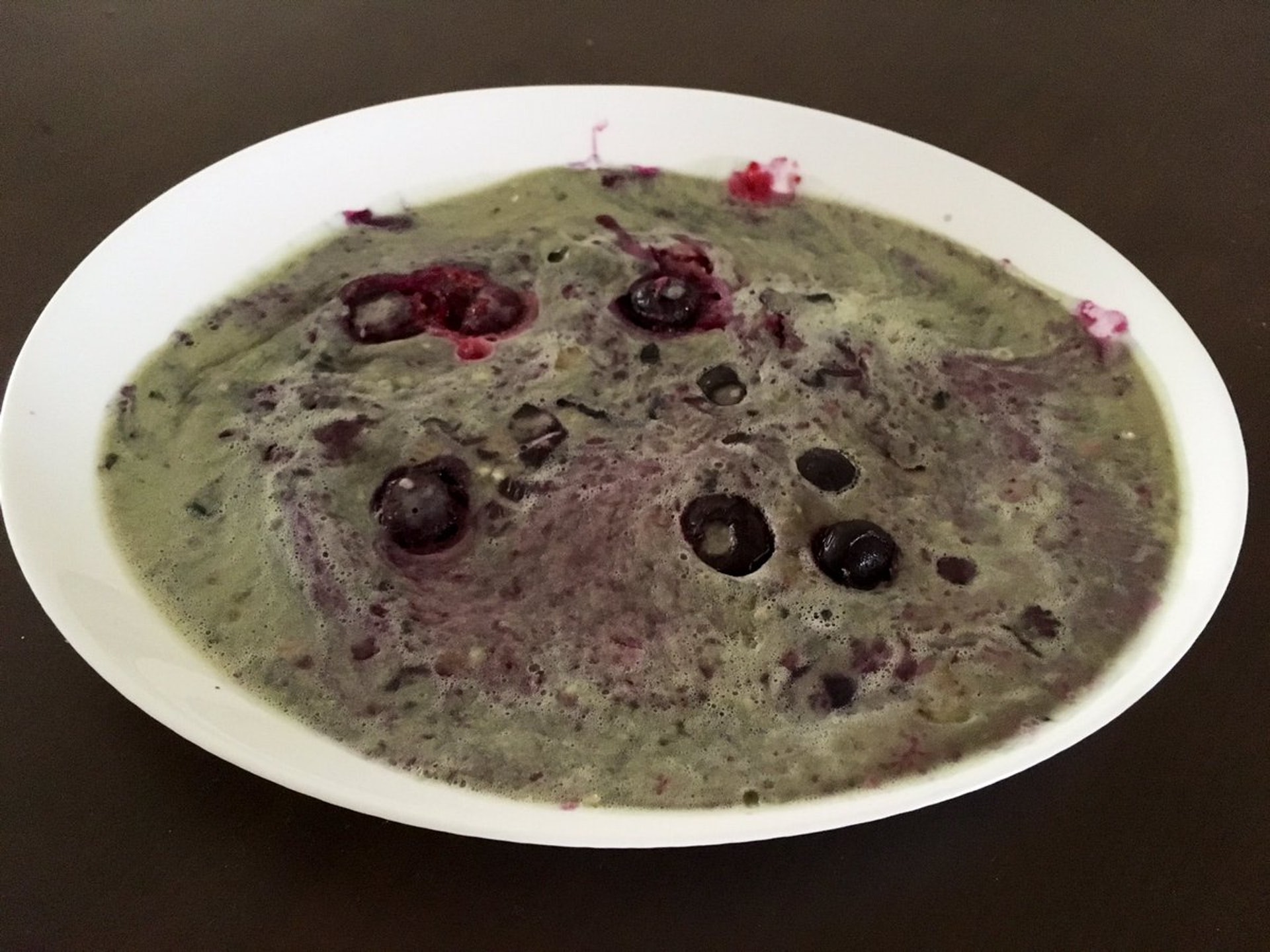【暗黑料理】有日本網民分享自製的藍莓鬆餅,卻變成一大盤猶如外星生物般的麵糊,焗起來更像星球表面。(Twitter「kg_twk」圖片)