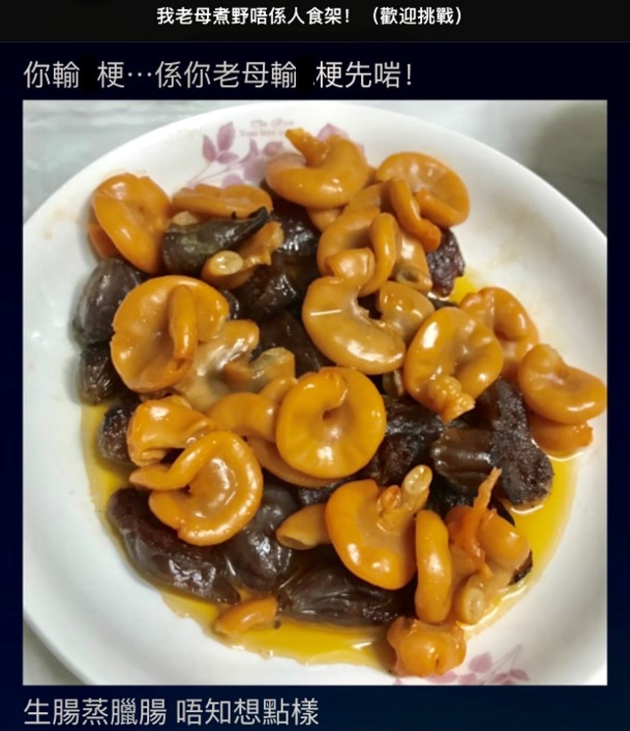 【阿媽暗黑料理】網民表示看得很清楚是生腸,但需要仔細打量,才知一塊二塊黑卒卒的是臘腸。(網上截圖)