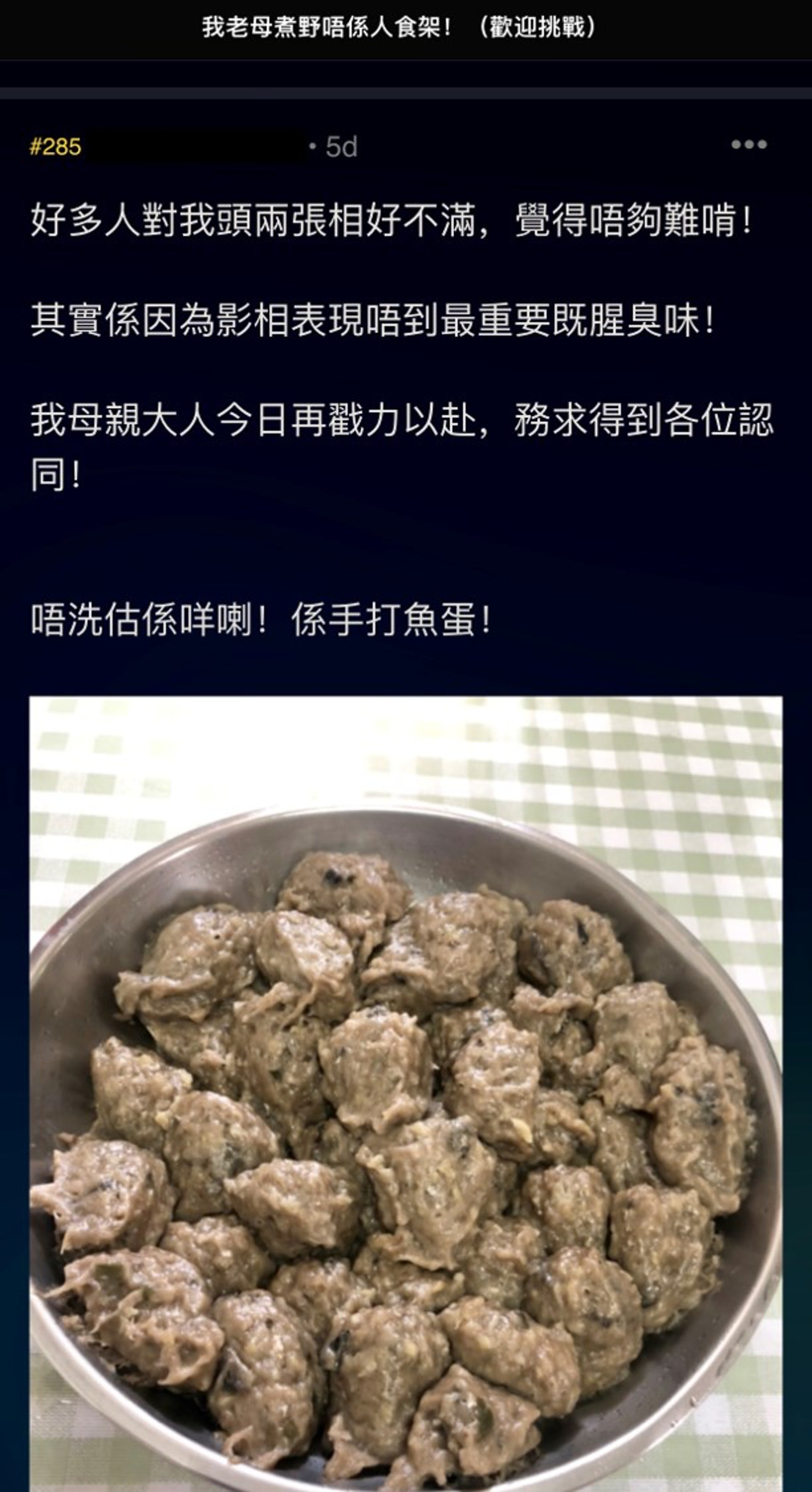 【阿媽暗黑料理】母親大人全力以赴打魚蛋,最點睛的一句是「張相表現唔到最重要的腥臭味。」(網上截圖)