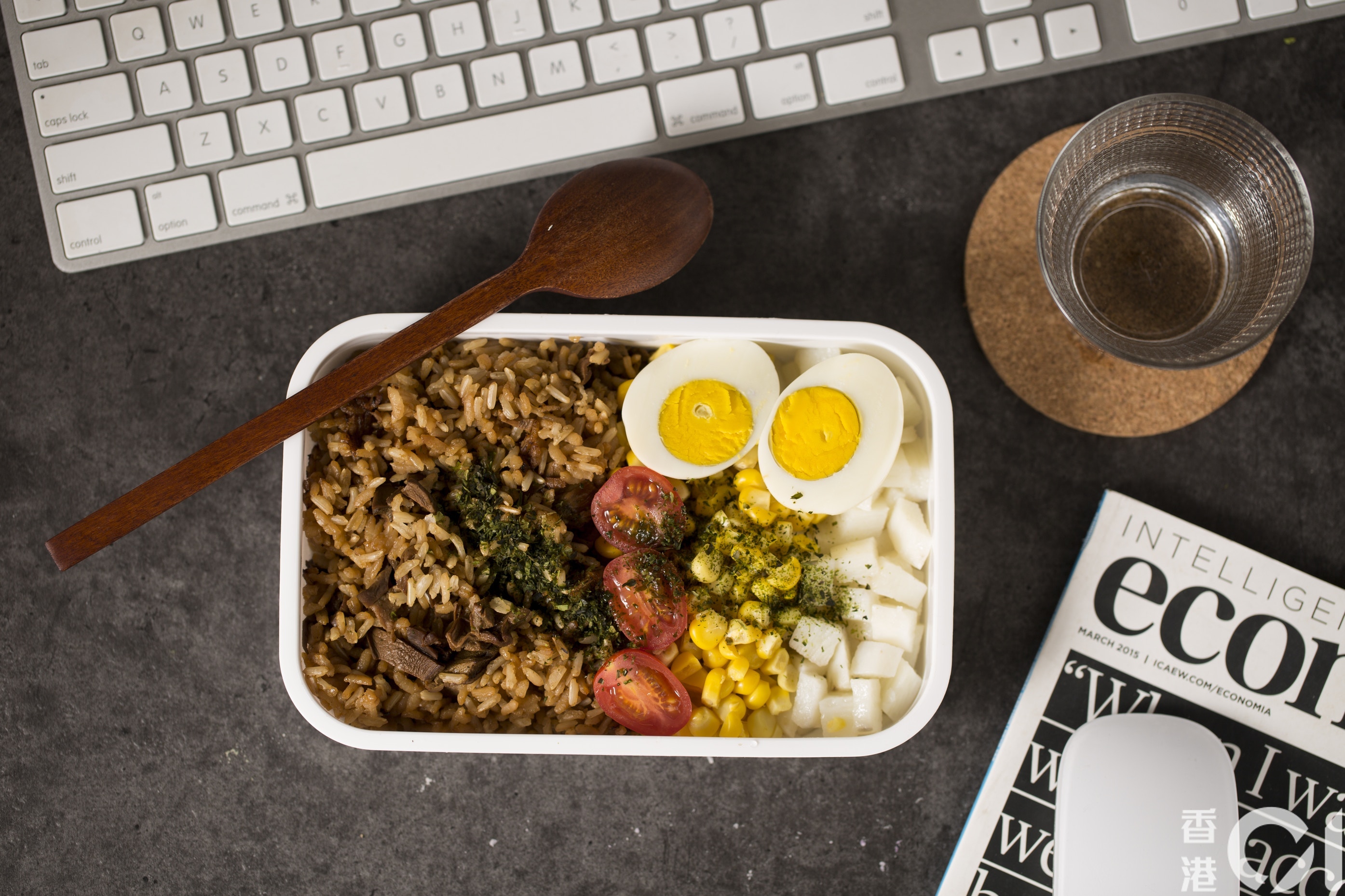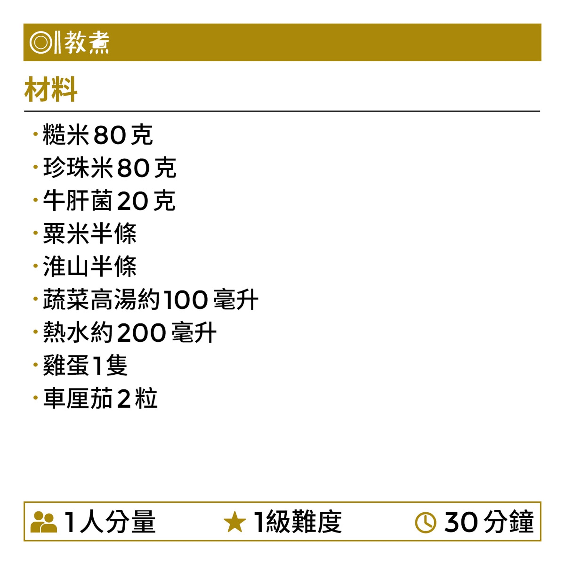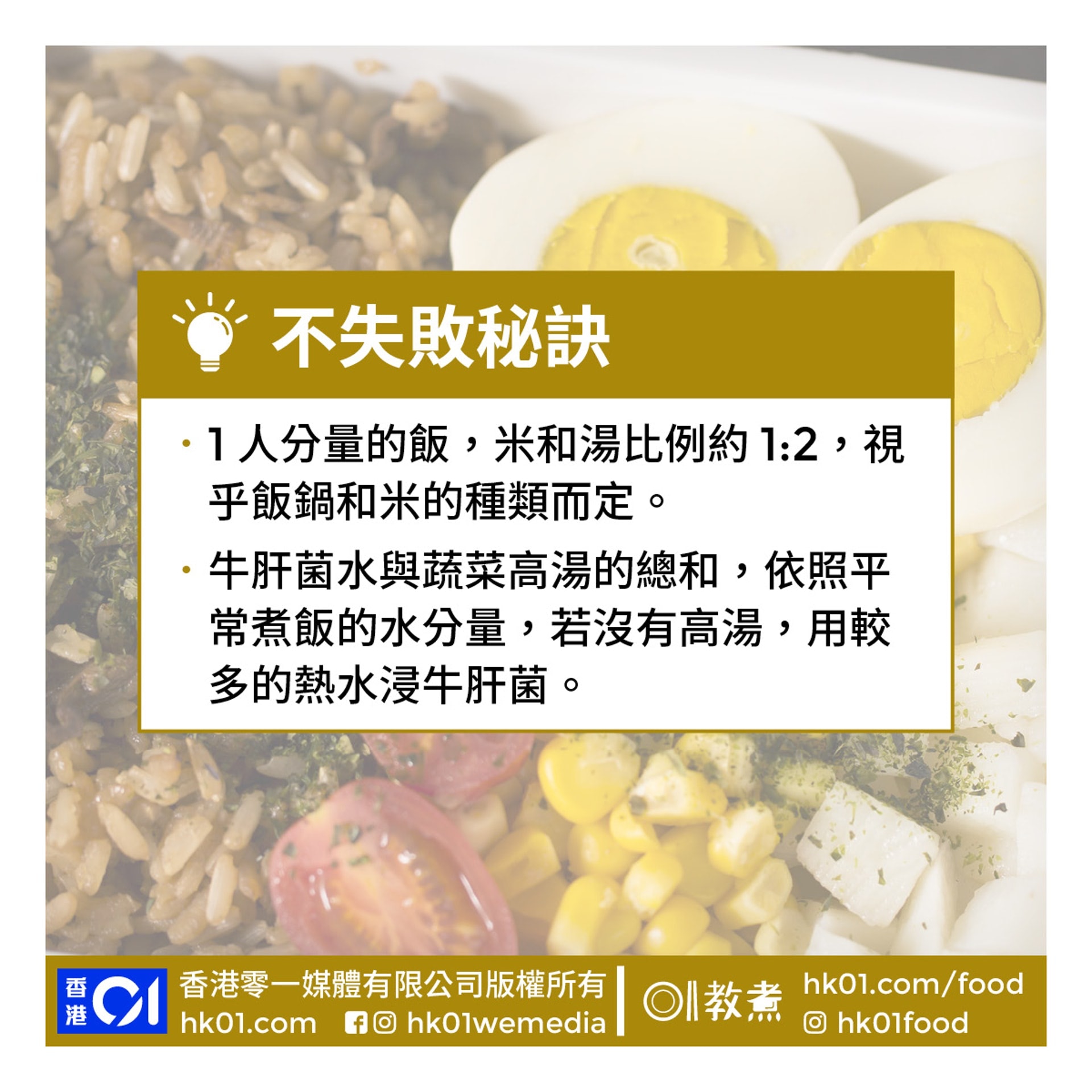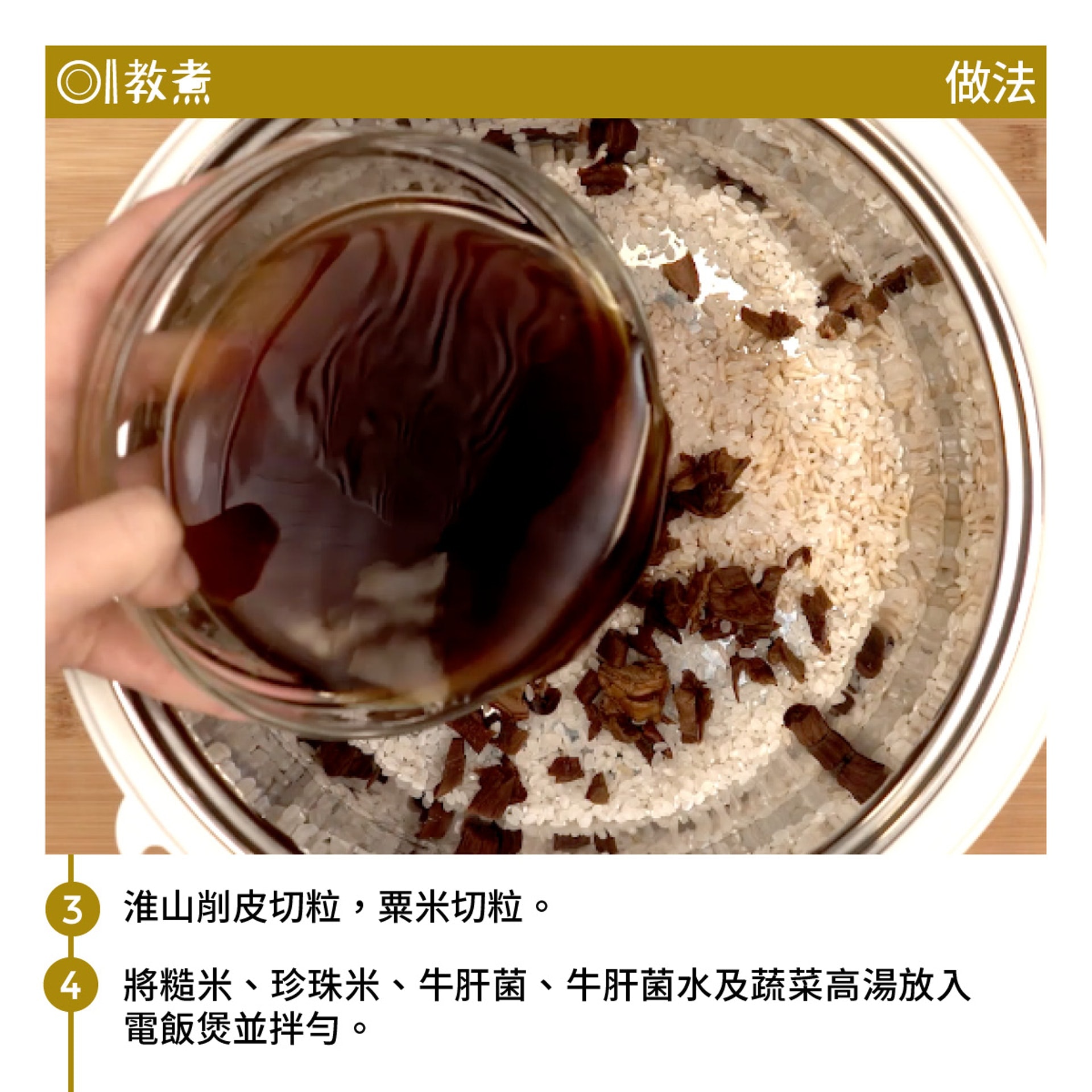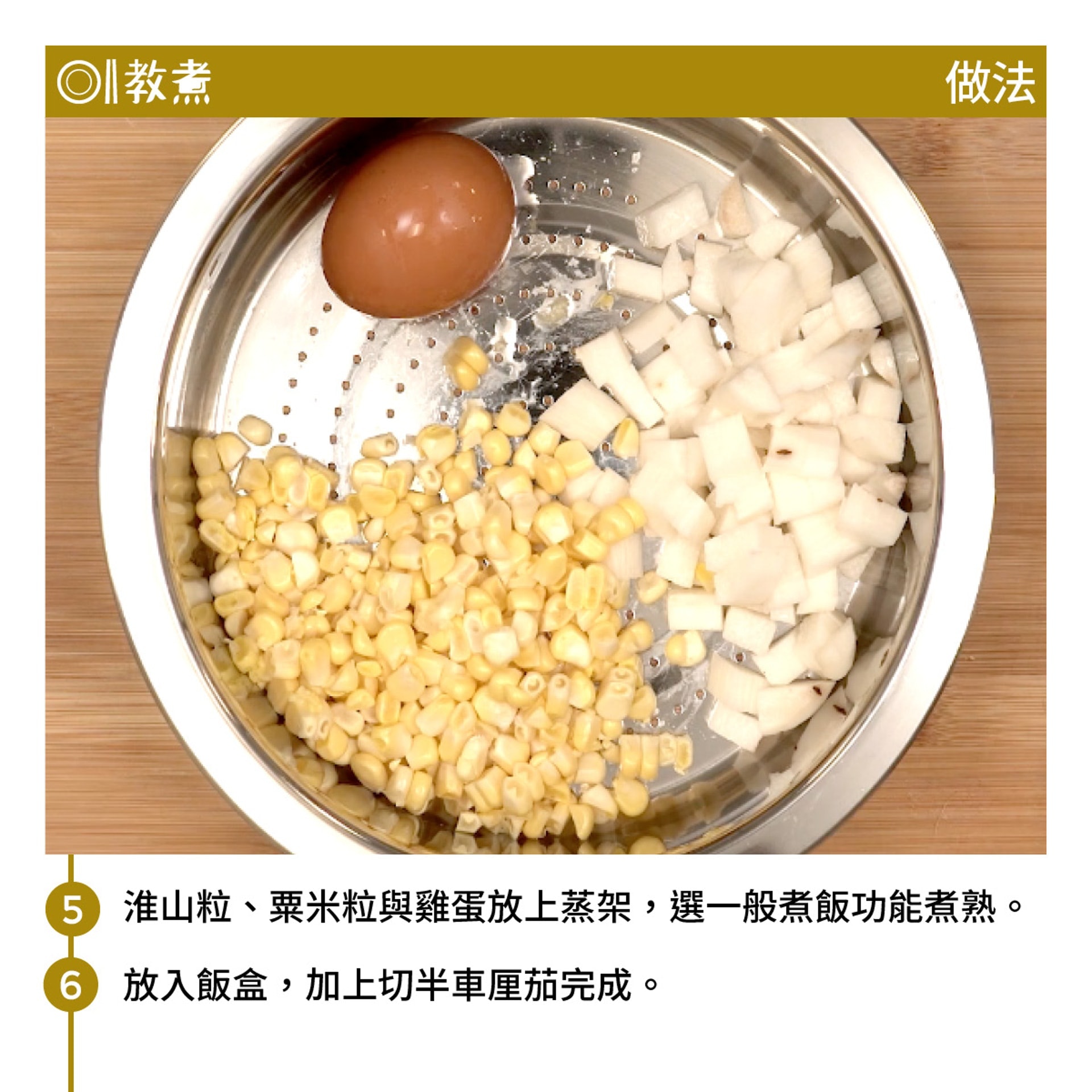 自己飯盒自己煮,電飯煲好使好用,加個蒸架便煮出無窮菜式。將牛肝菌用熱水浸30分鐘,浸菇水留用煮飯,飯香更濃。以1:1的糙米和白米煮飯,放入蔬菜高湯、淮山粒、粟米粒後放上蒸架,加隻雞蛋,撳掣等食。