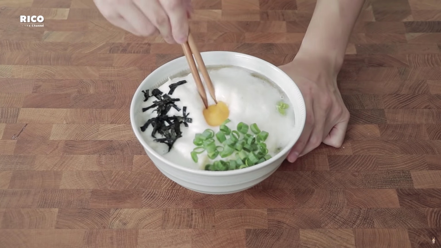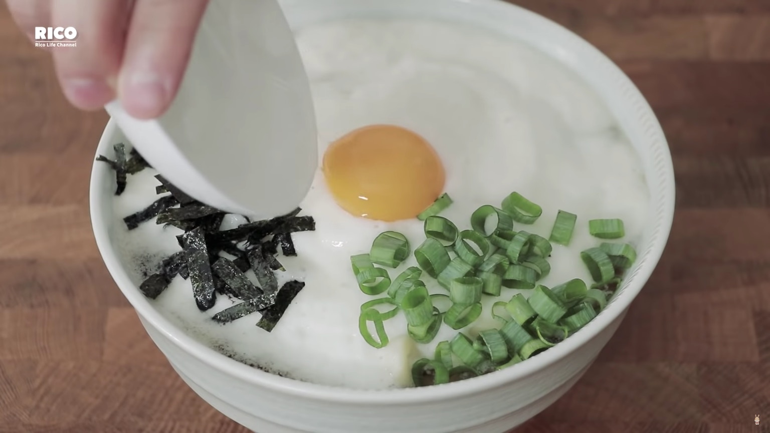 將淮山蓉、紫菜絲、葱花、蛋黃和芥末鋪在烏冬上。(影片截圖:RICO)