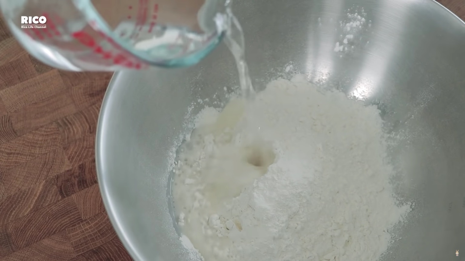 先在中筋麵粉裡加入鹽水,用手快速攪拌。(影片截圖:RICO)
