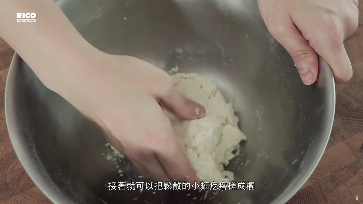 攪拌後,會見到一粒粒鬆散的小麵「疙瘩」,再把它慢慢搓成糰。(影片截圖:RICO)