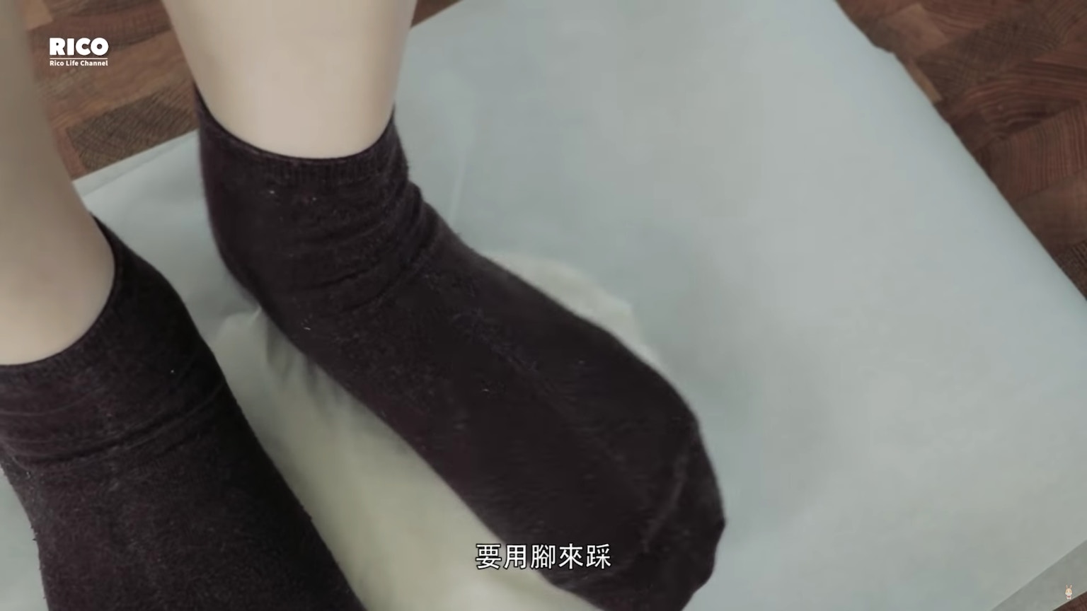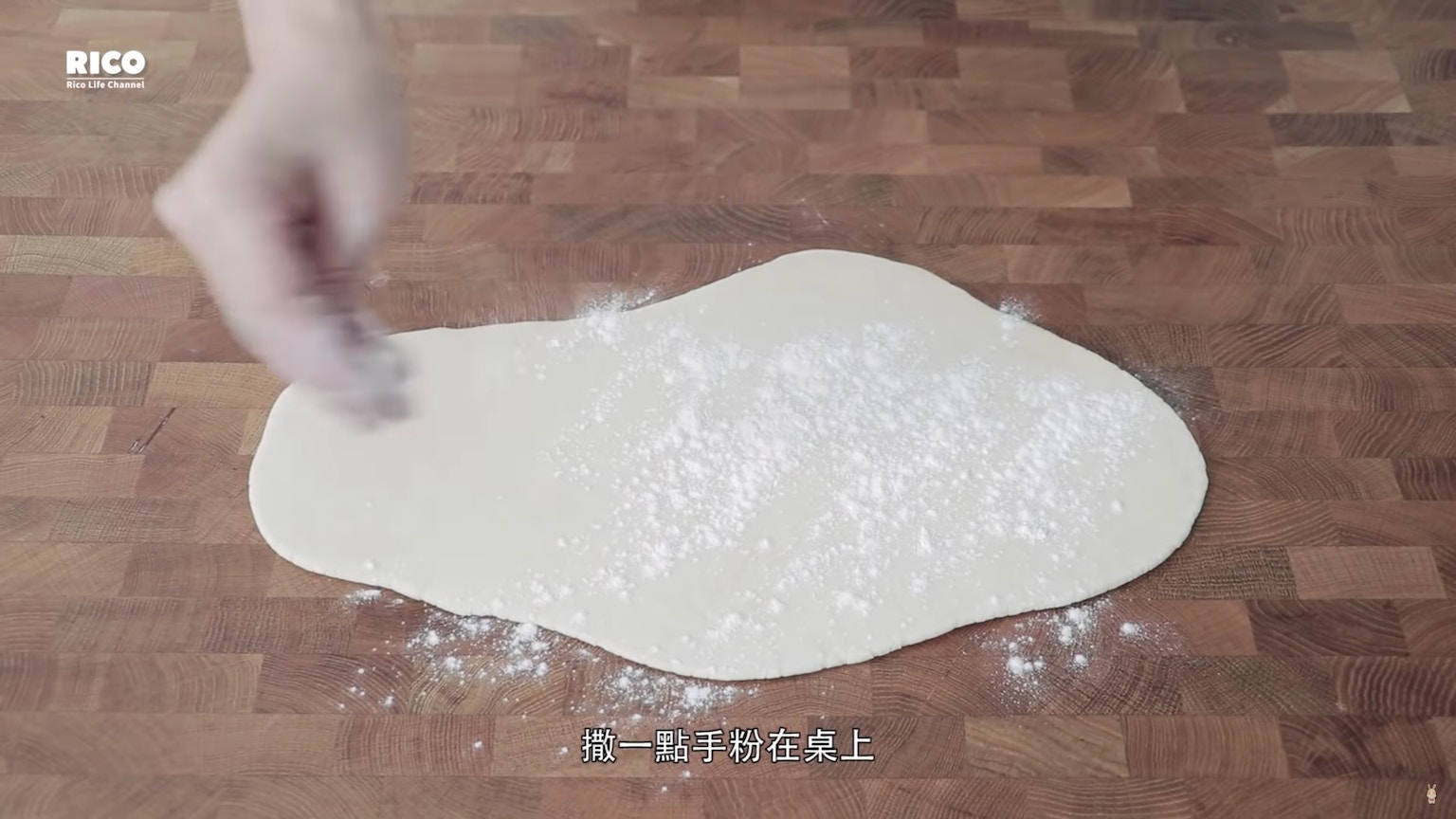 擀平麵糰,灑點手粉。(影片截圖:RICO)