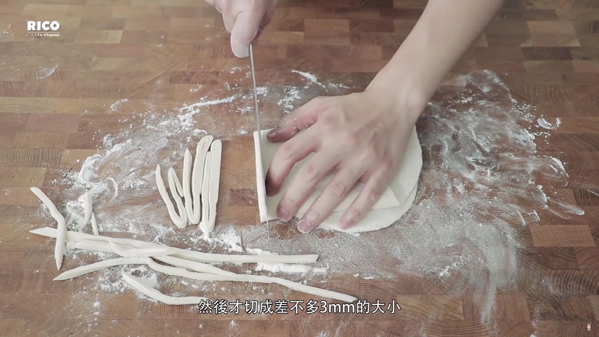 將麵糰切成差不多每條3毫米粗,成為烏冬。(影片截圖:RICO)