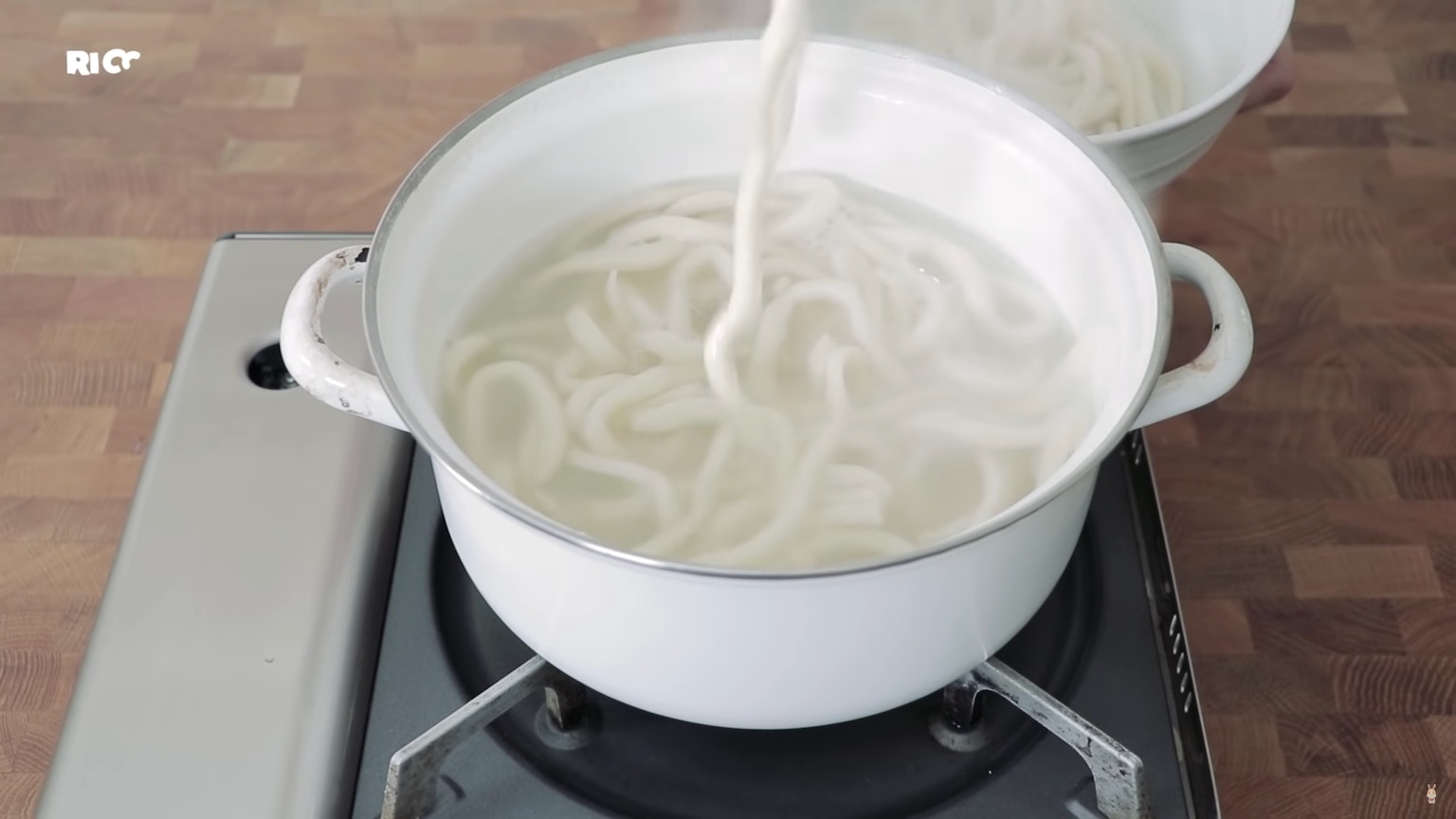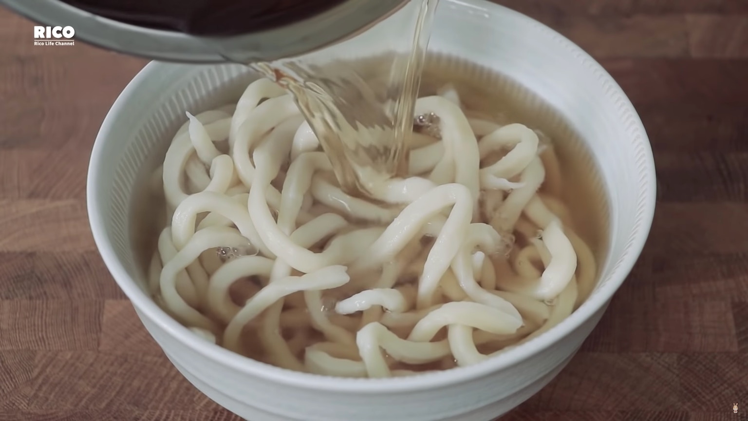把高湯倒入烏冬裡。(影片截圖:RICO)