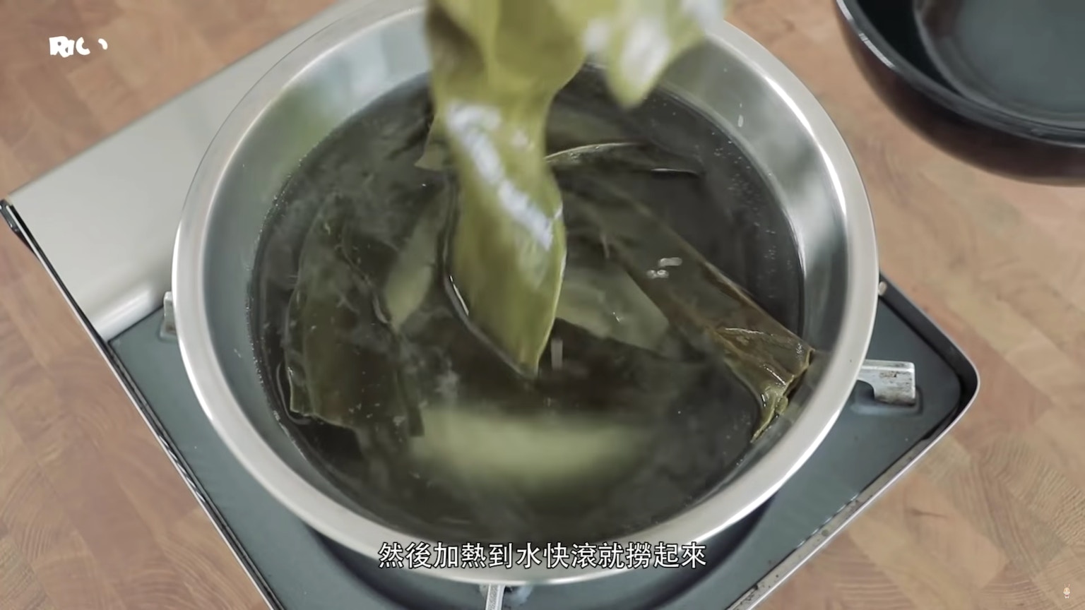 開一鍋室溫水,加入昆布,到水快滾就把昆布拿起來。(影片截圖:RICO)