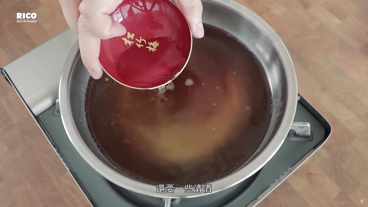 加清酒煮至酒精揮發,再加入醬油(影片截圖:RICO)