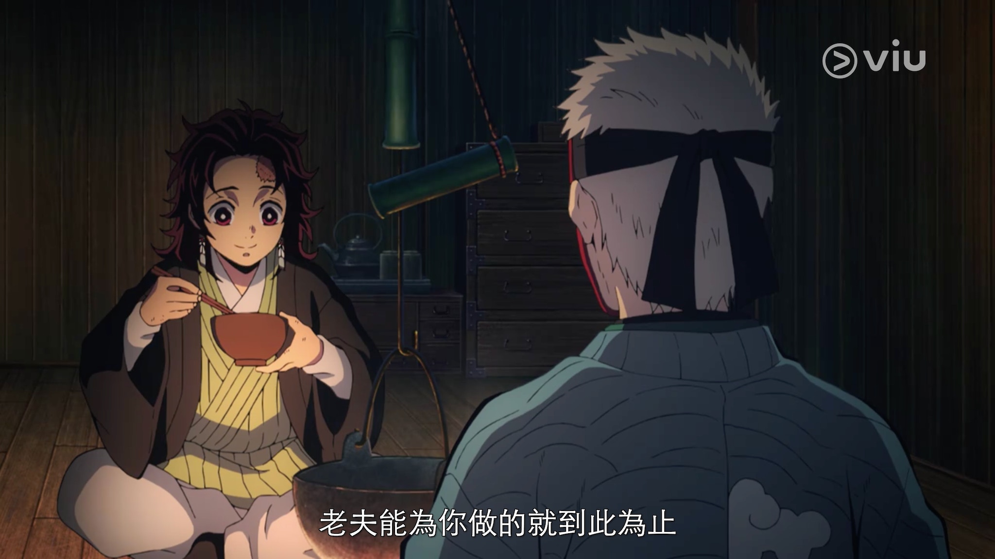 鱗瀧師父見炭治郎辛苦完成修煉,為他做了個超豐盛的火鍋,叫他即管放心食。(影片截圖:ViuTV《鬼滅之刃》)