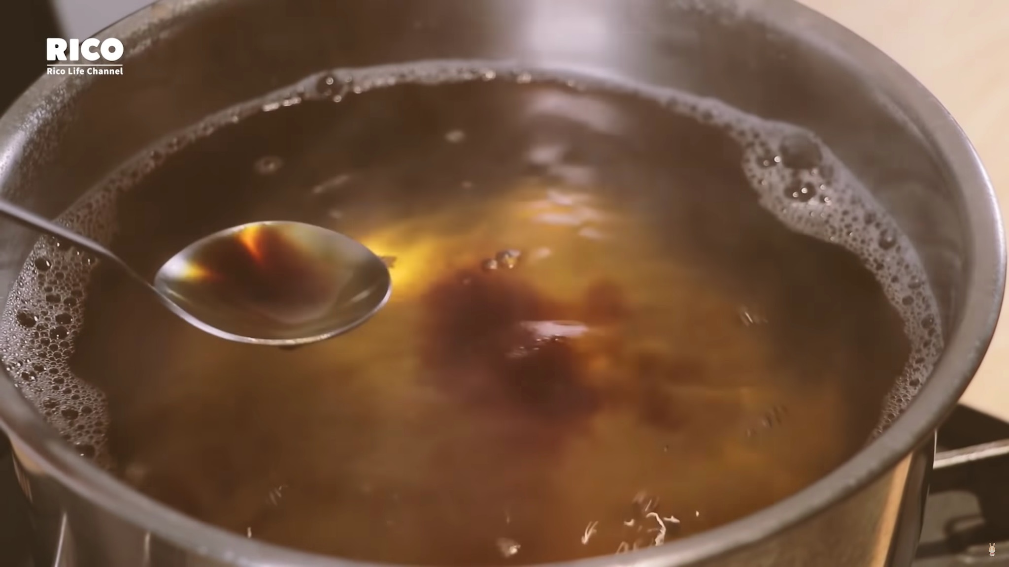 昆布湯底加鰹魚醬油、柴魚片後,濾走柴魚片,再下清酒煮至酒精揮發。(影片截圖:RICO)