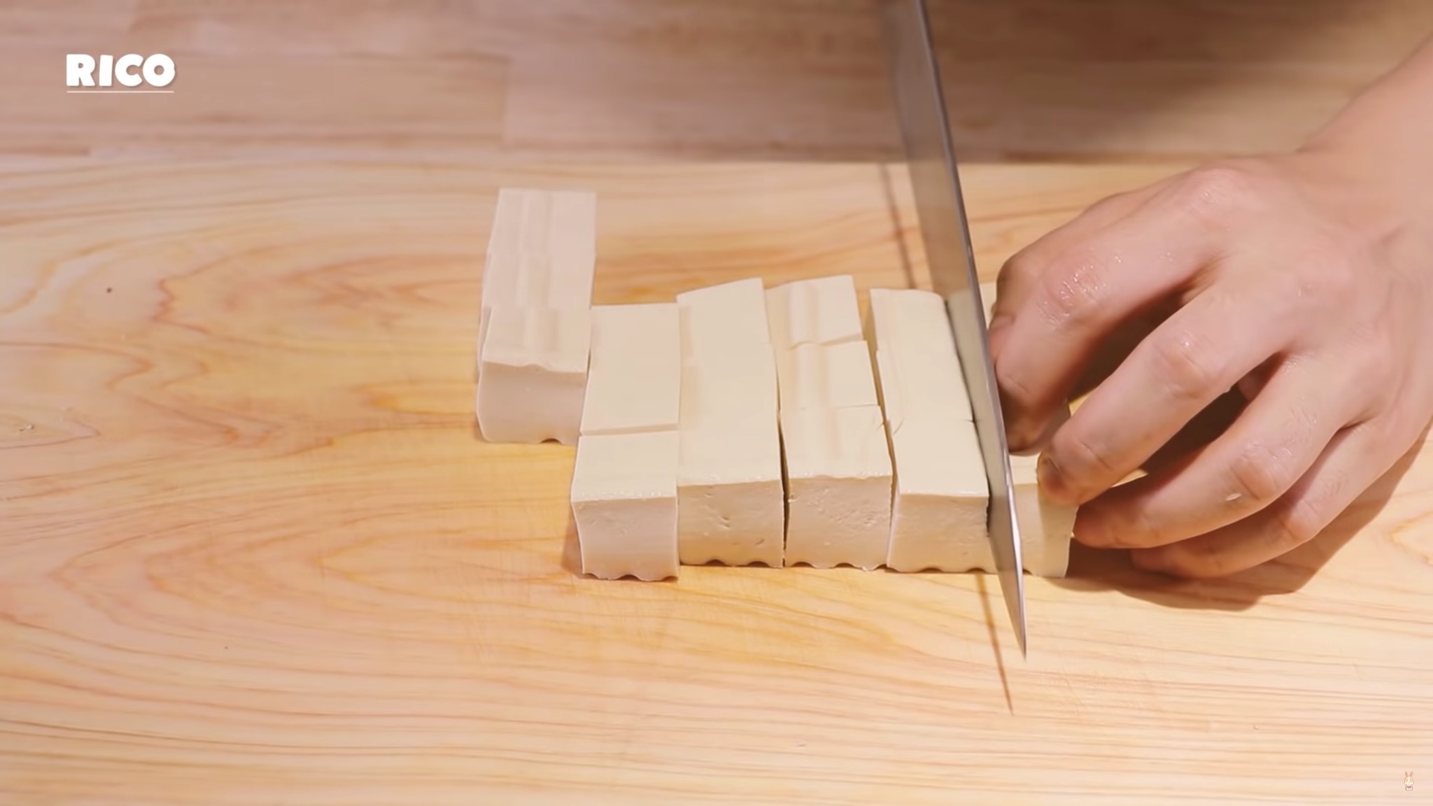 把豆腐切成小塊。(影片截圖:RICO)