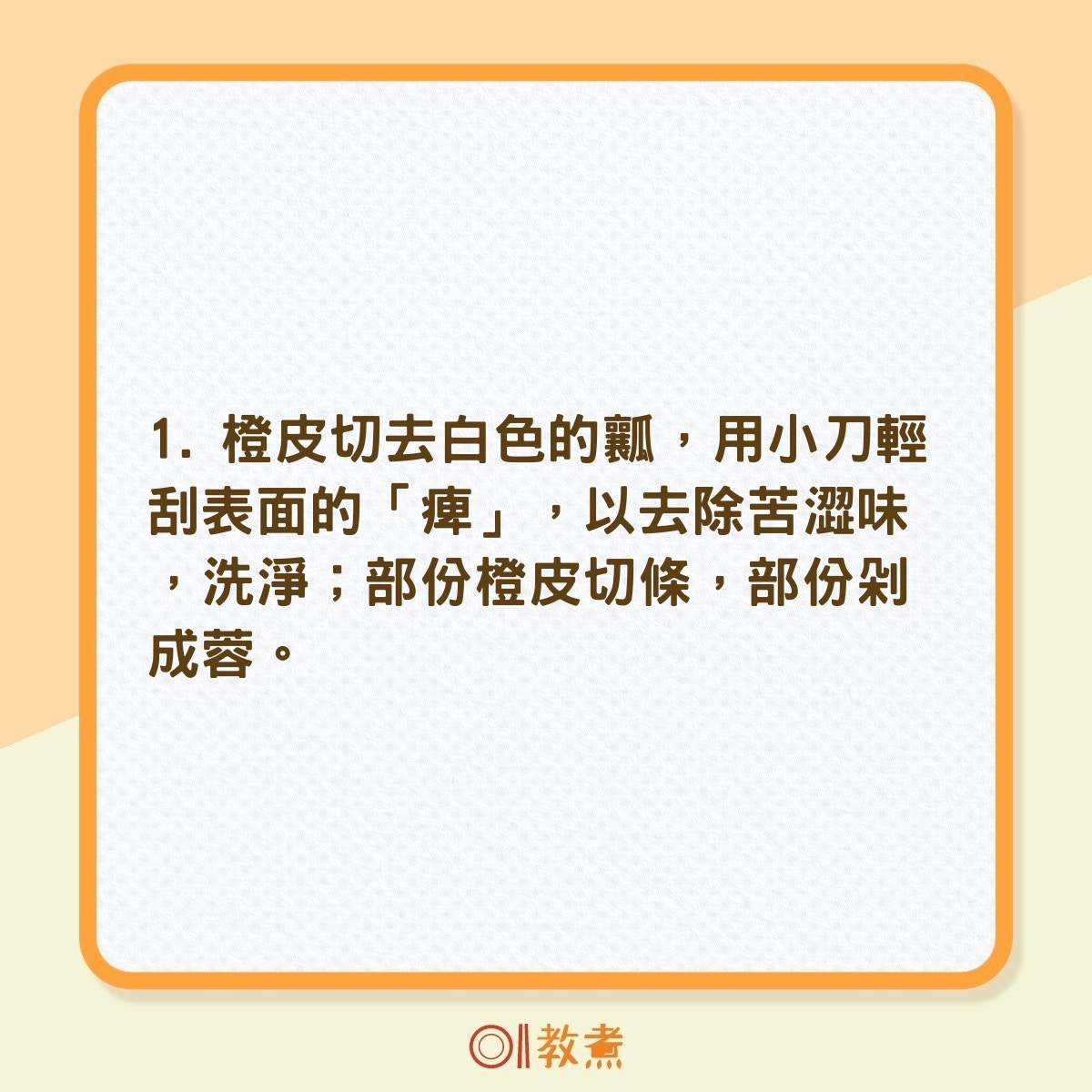 橙皮切去白色的瓤,用小刀輕刮表面的「痺」,以去除苦澀味,洗淨;(《鼎爺廚房2》,萬里機構授權使用)