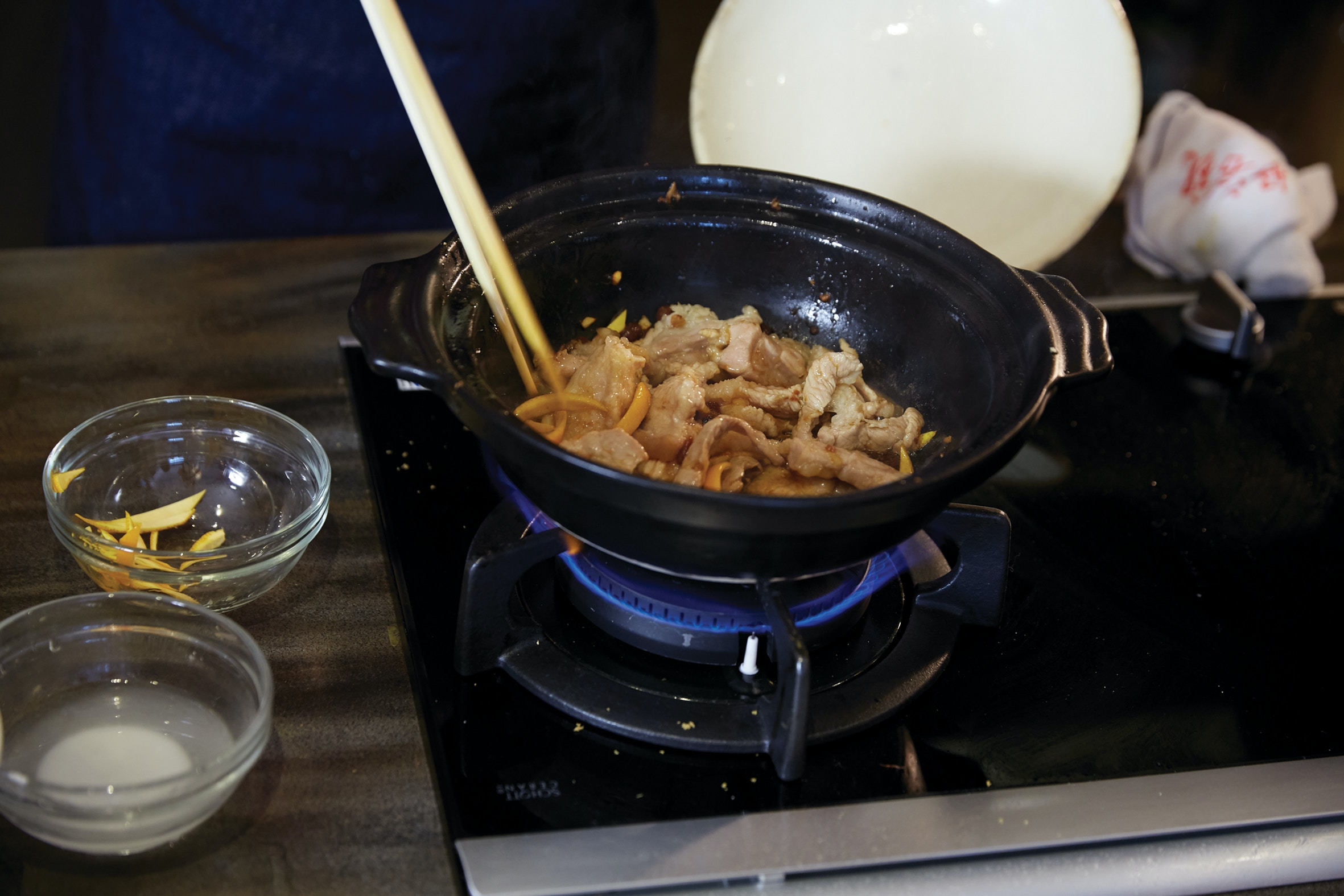 大火燒熱砂鍋,下油,倒入蒜蓉和薑蓉,爆香五花腩片,炒至五花腩片六至七成熟,下橙皮條和甜麵豉醬,拌勻後轉為中火,焗3至4分鐘。(《鼎爺廚房2》,萬里機構授權使用)
