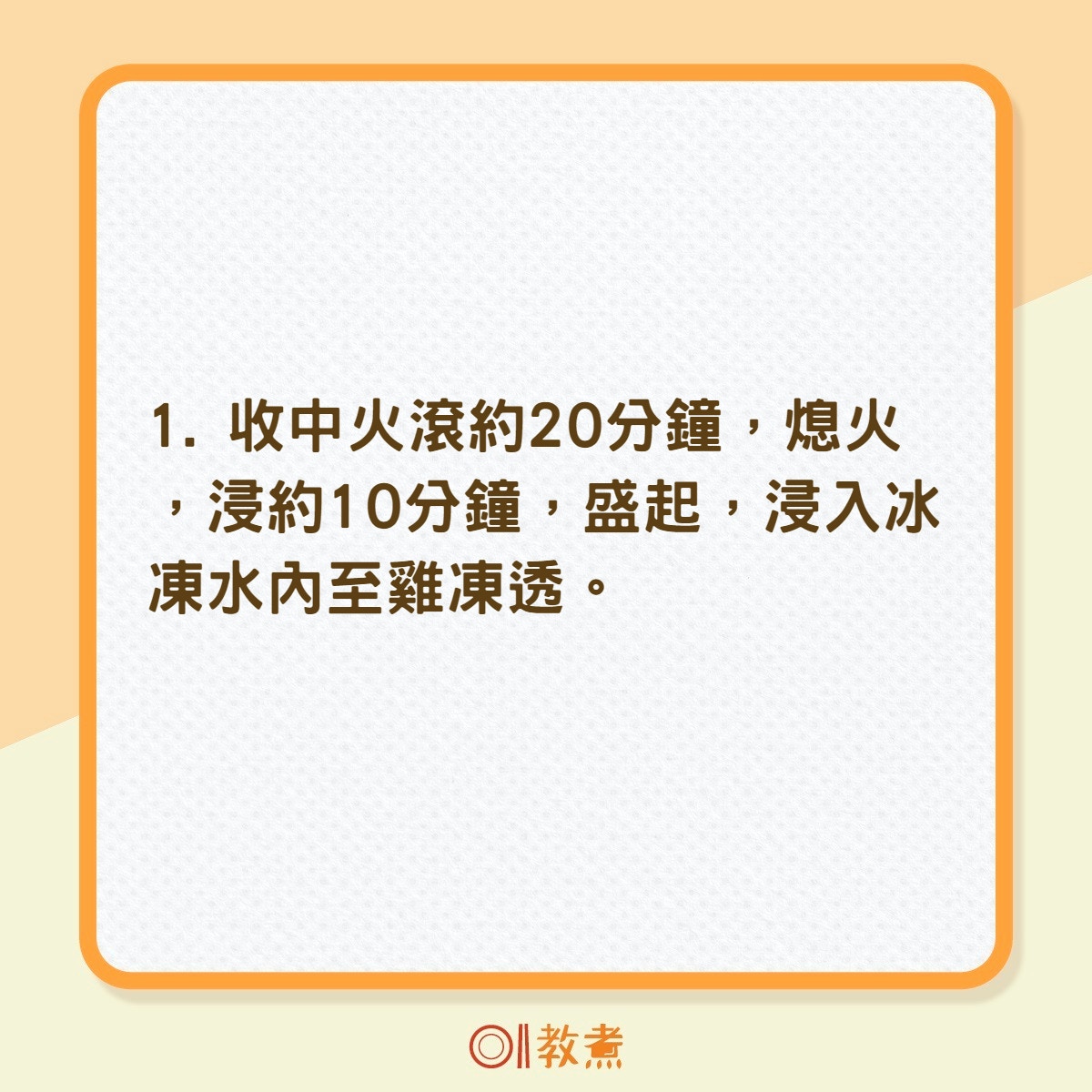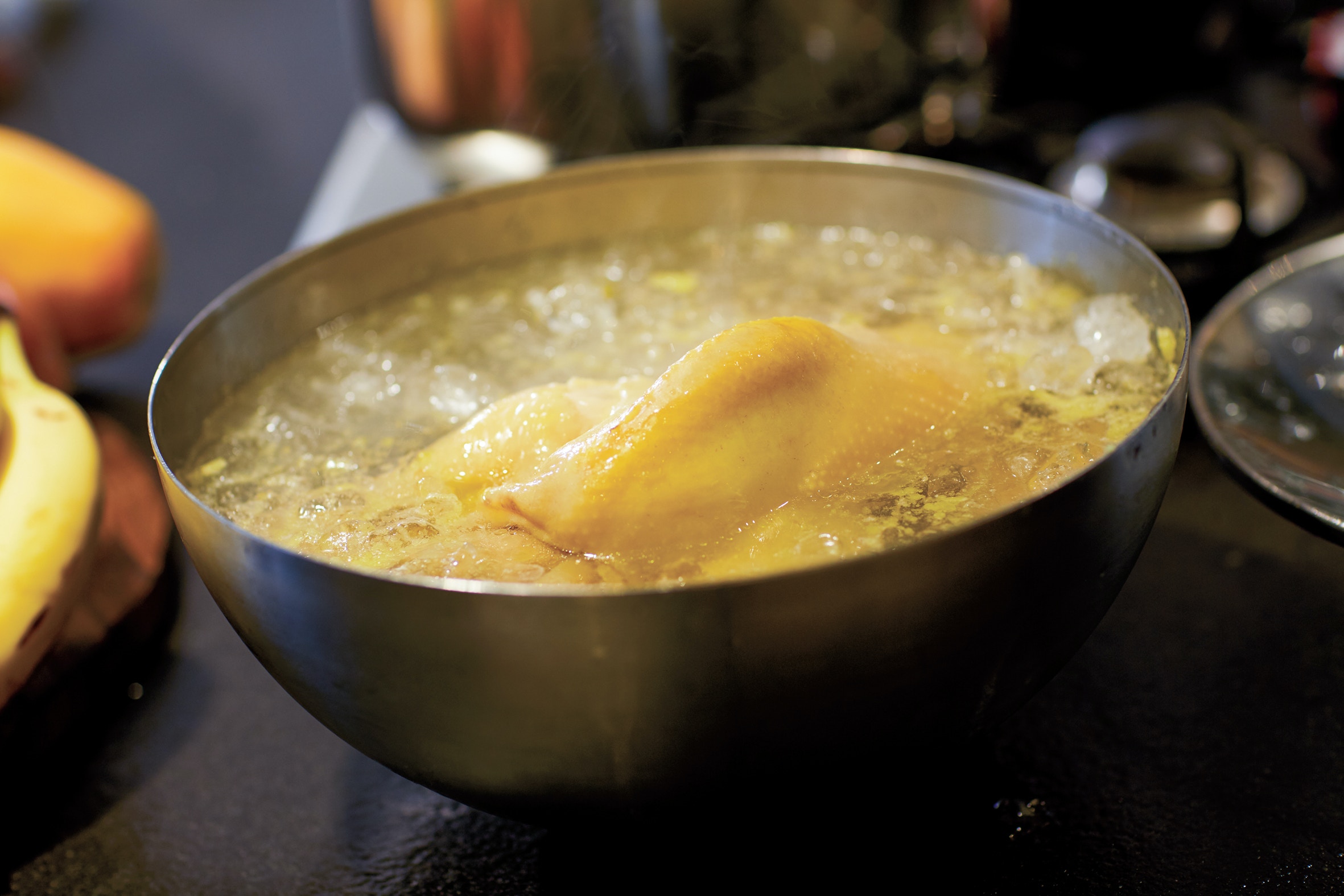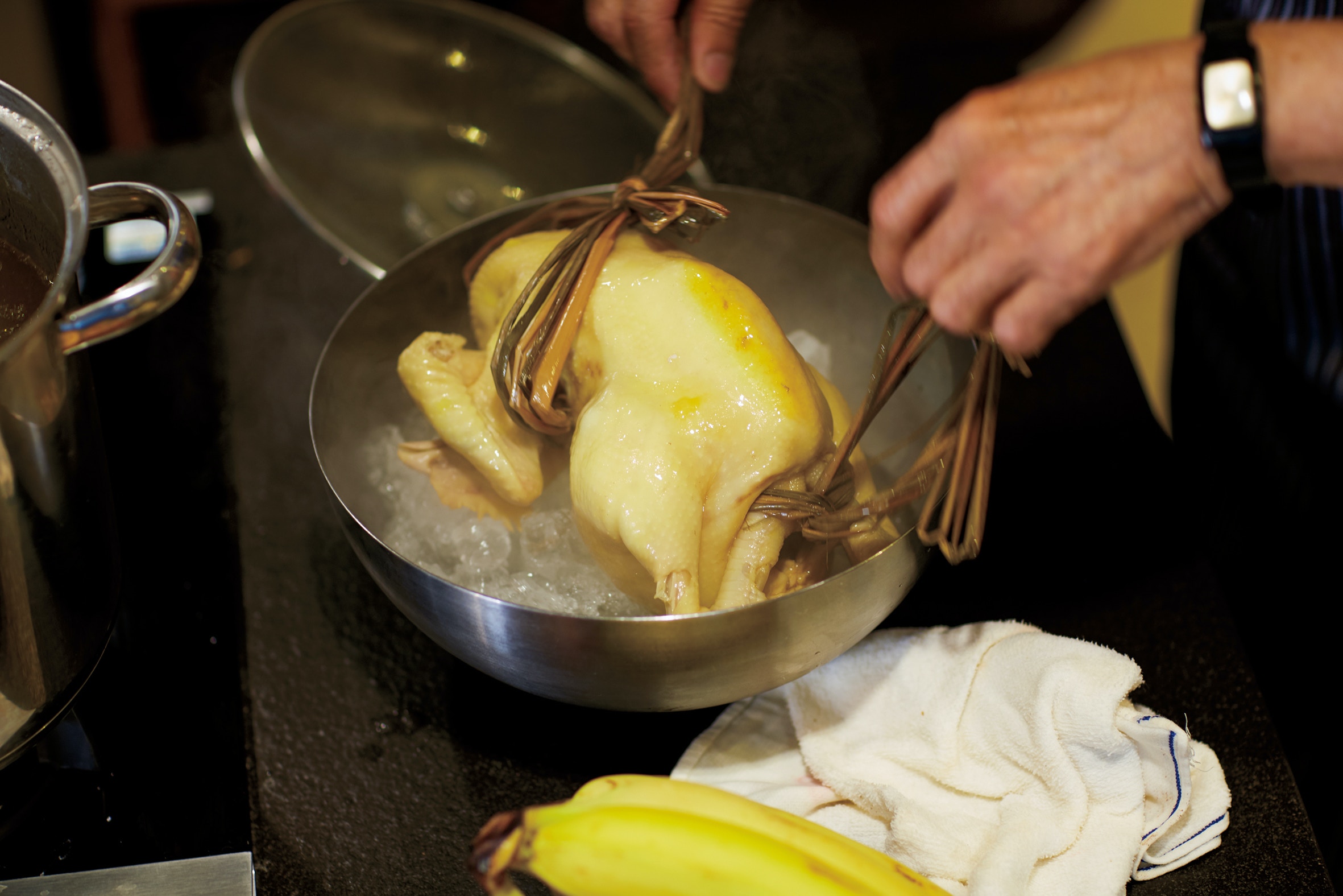 收中火滾約20分鐘,熄火,浸約10分鐘,盛起,浸入冰凍水內至雞凍透。(《鼎爺廚房》,萬里機構授權使用)