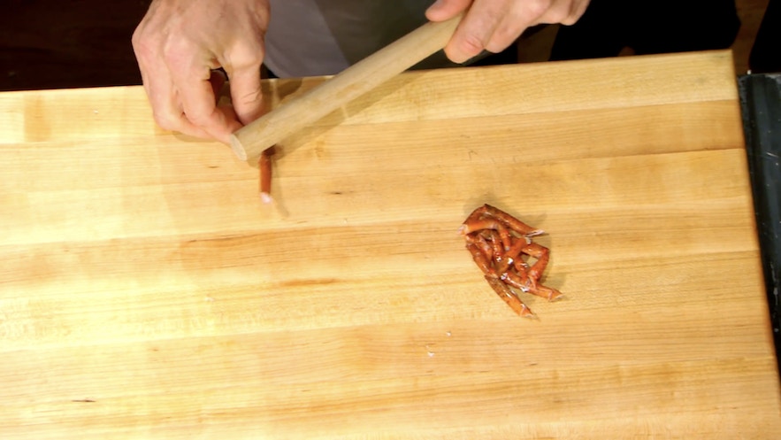 起出龍蝦腳的肉需要工具輔助,那就是整麵包常用的擀麵棍。(影片截圖:MasterChef On FOX)