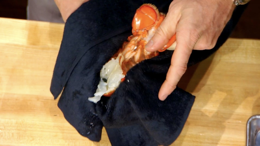手執一塊毛巾,將龍蝦身體翻轉並攤在毛巾上,用手輕輕地擠它,好讓龍蝦肉更易鬆脫。(影片截圖:MasterChef On FOX)