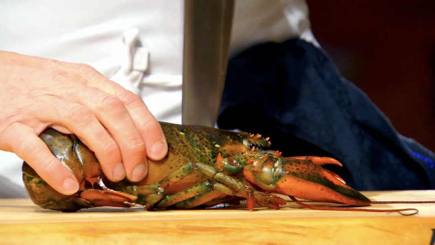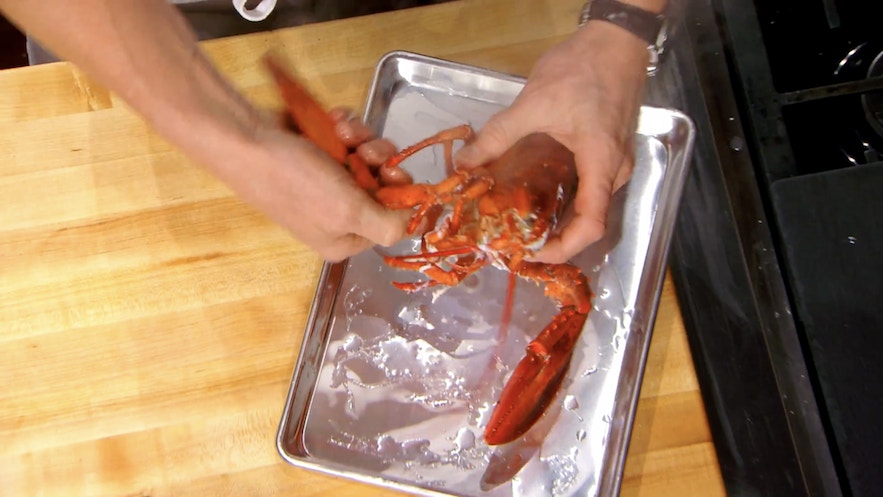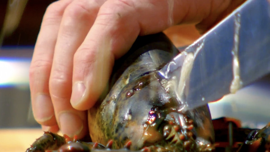 第一步:中斷龍蝦的知覺|龍蝦頭有條痕,Gordon以此為下刀位置。(影片截圖:MasterChef On FOX)