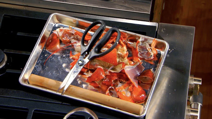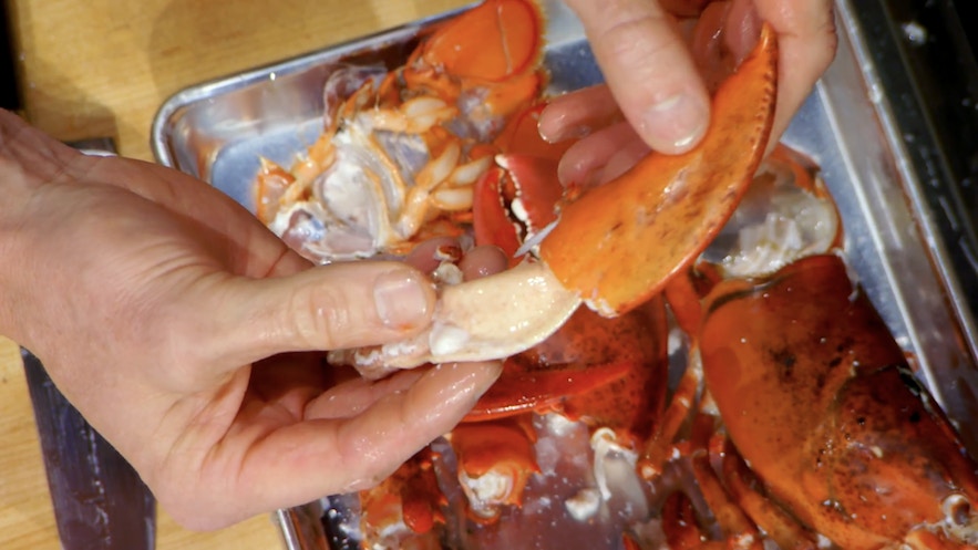 第六步:龍蝦腳起肉|將龍蝦腳剪斷一小節,讓它有開口位將龍蝦肉褪出來。(影片截圖:MasterChef On FOX)