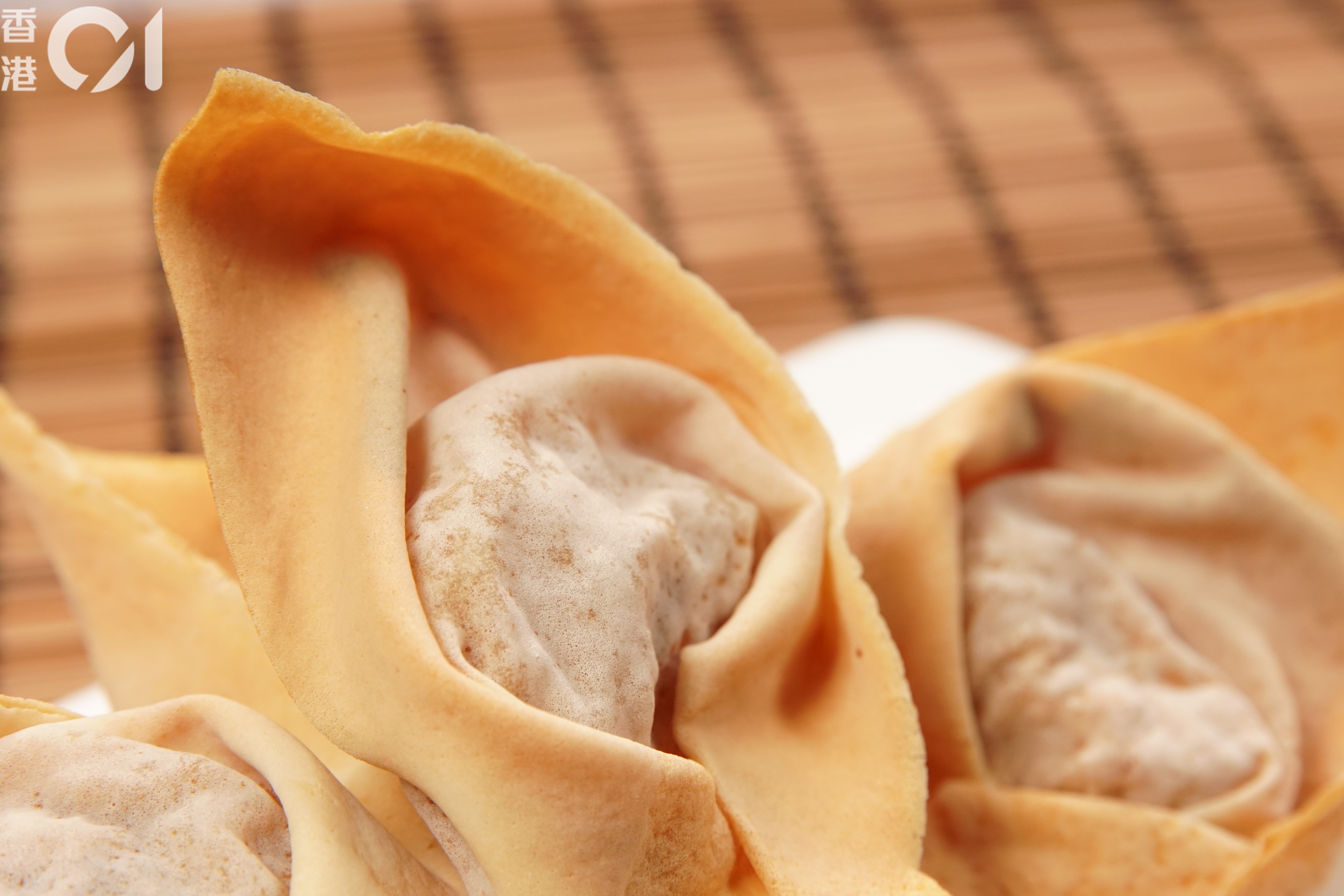 炸起一樣有脆卜卜、大泡泡的效果。」但因為太細塊的關係,最後揀了做「炸雲吞」的春卷皮取締,包些許素肉餡大小適中。
