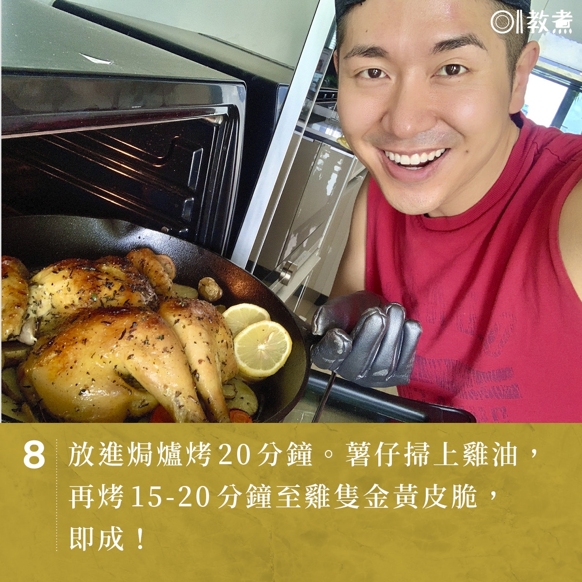 8.放進焗爐烤20分鐘。薯仔掃上雞油,再烤15 - 20分鐘至雞隻金黃皮脆,即成!