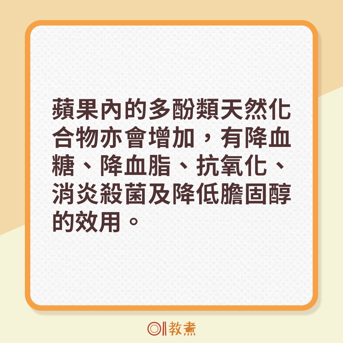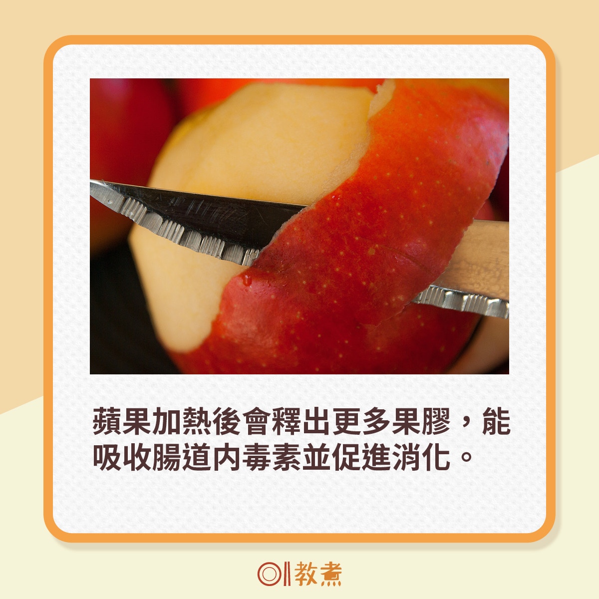 蘋果含豐富果膠,尤其蘋果皮,加熱後蘋果會釋出更多果膠。果膠是膳食纖維的一種,能吸收腸道内毒素並促進消化。有研究指,蘋果加熱後多酚類天然化合物增加,食用後能降血糖、降血脂、抗氧化、消炎殺菌及降低膽固醇。