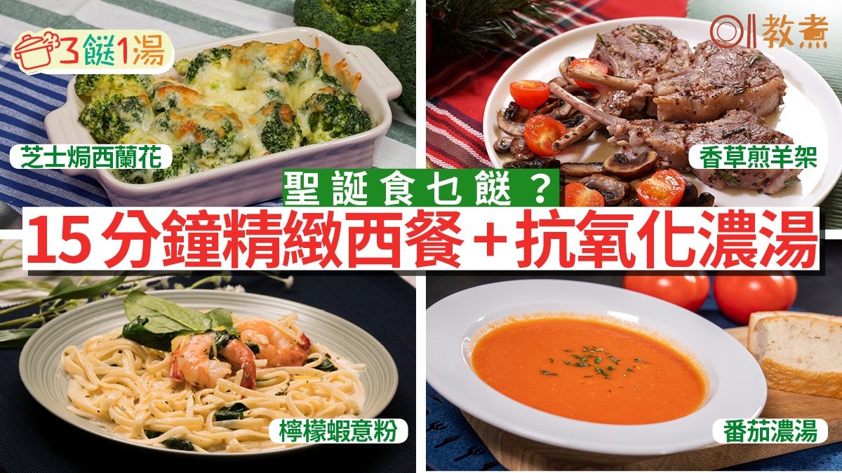 [食譜分享] 轉載 :【聖誕三餸一湯】芝士焗西蘭花+香草煎羊架+檸檬蝦意粉+番茄濃湯【聖誕二人餐食譜】精美簡易聖誕餐12提案 一個氣炸鍋都搞得掂! |