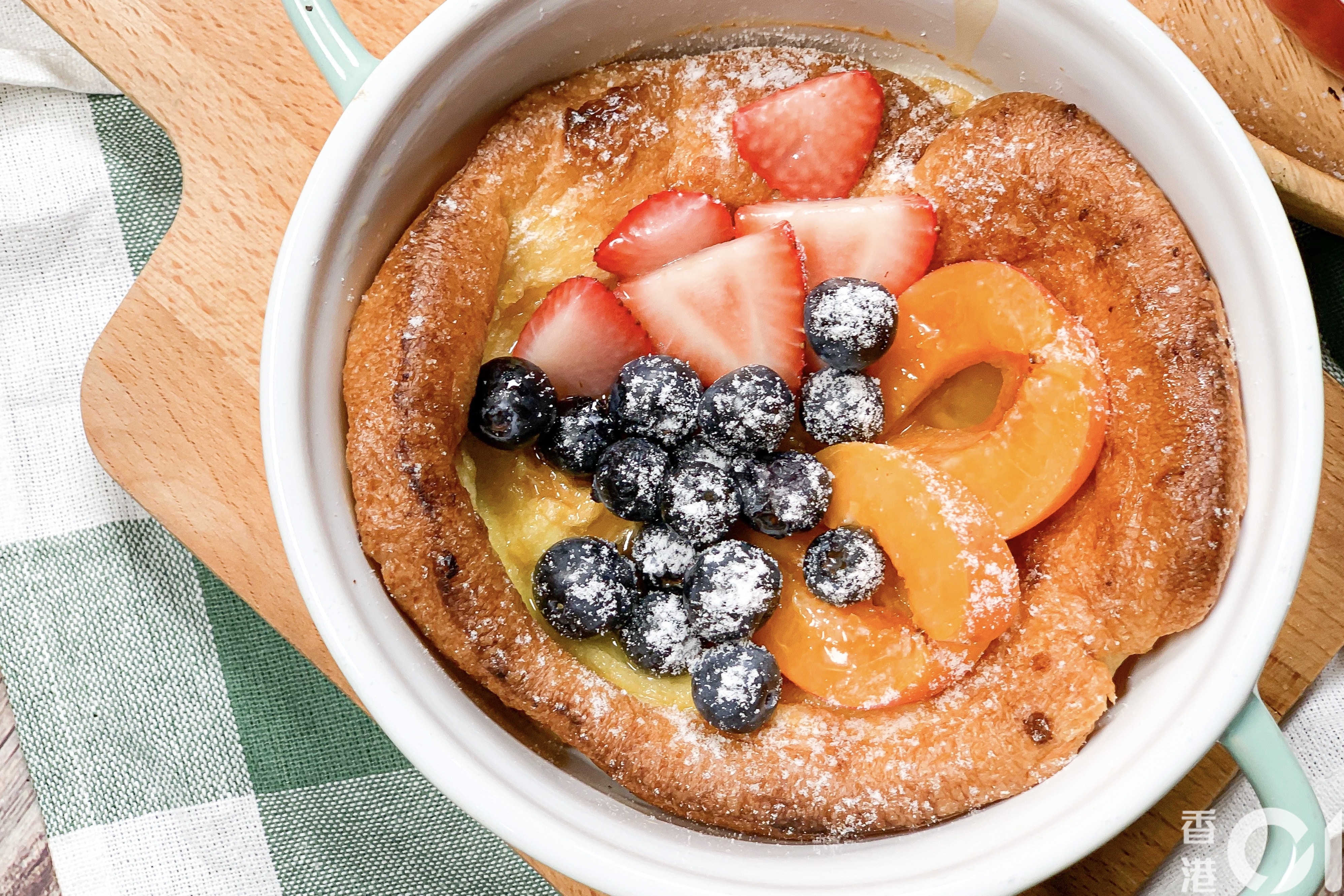 Dutch Baby Pancake,吃甜的配各式水果、蜜糖或楓糖;吃鹹的可配煙肉、芝士及雞蛋。(尹嘉蔚攝)