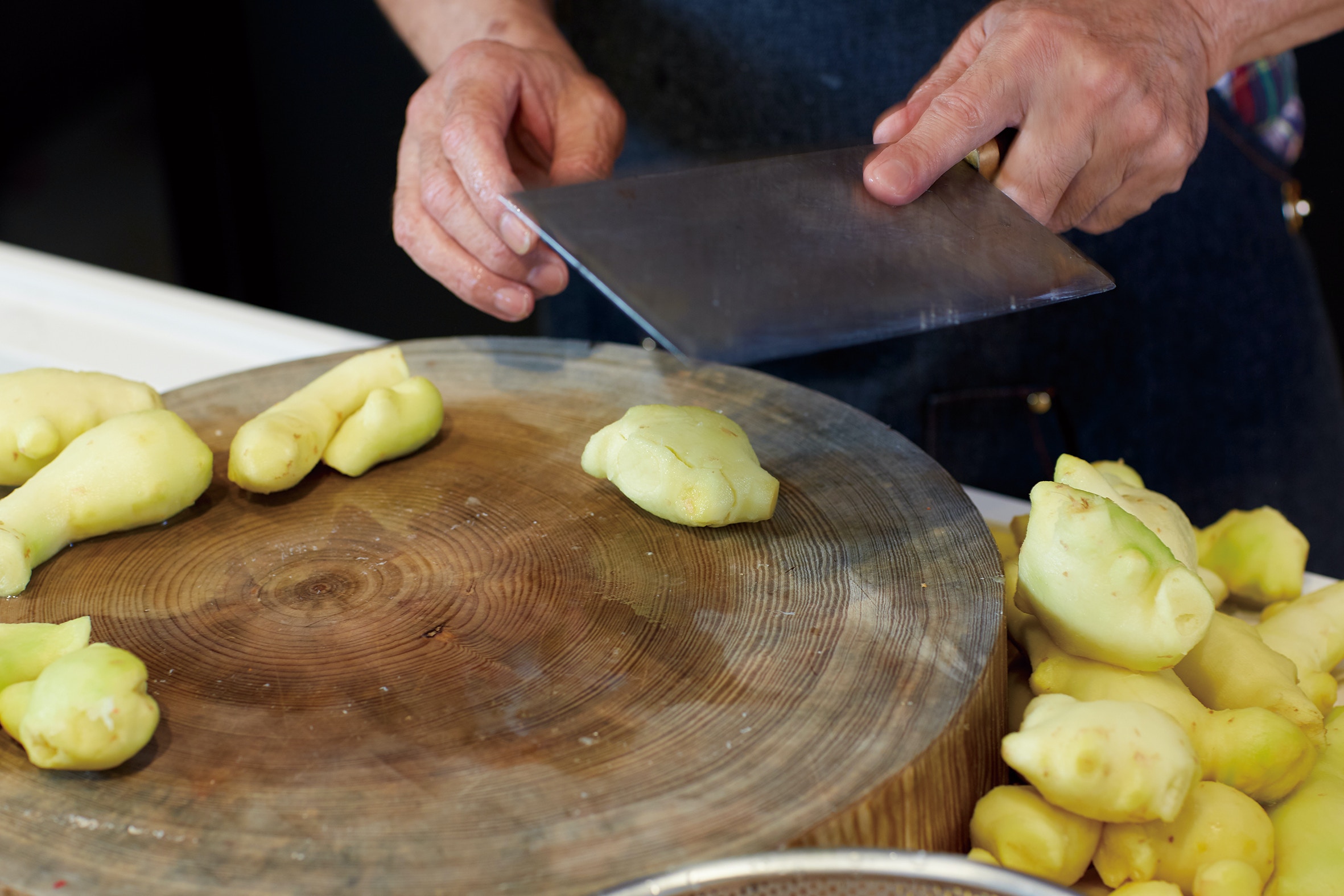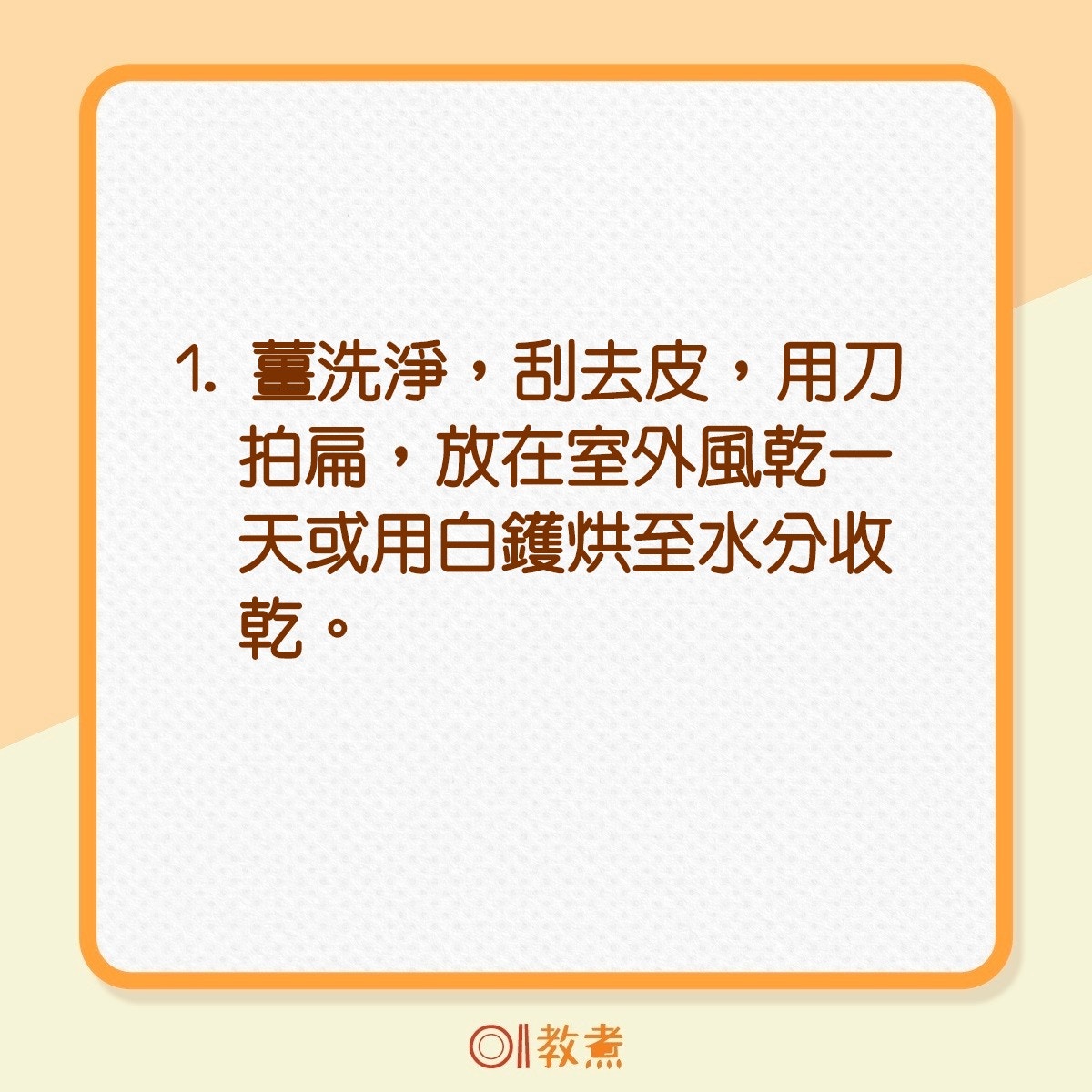 薑洗淨,刮去皮,用刀拍扁,放在室外風乾一天或用白鑊烘至水分收乾。(《鼎爺廚房3》,萬里機構授權使用)