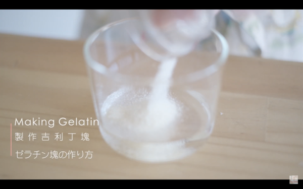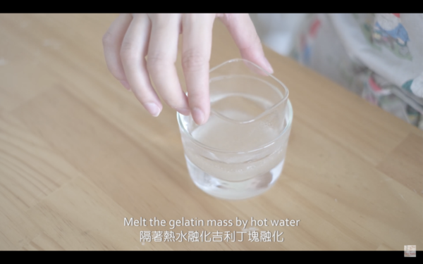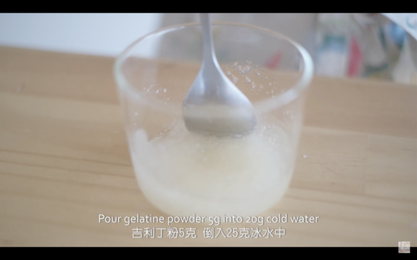 1. 5克吉利丁粉倒入25克凍水,靜置30分鐘,用熱水坐融吉利丁