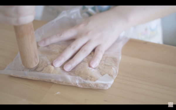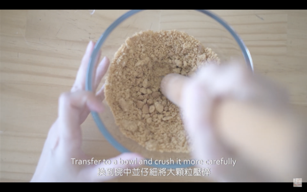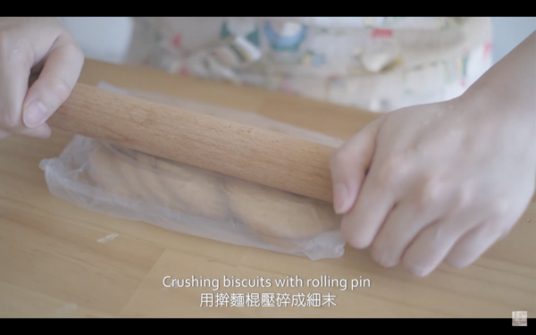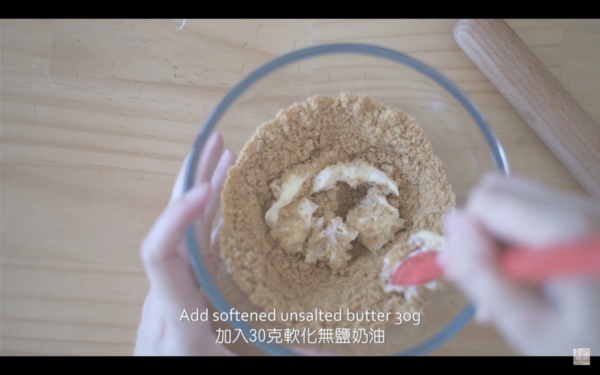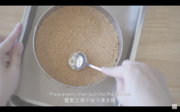 2. 壓碎消化餅後混合牛油,放入模中壓成餅底,冷藏