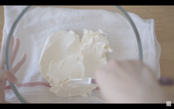 4. 將忌廉芝士打發至軟身,分次加入糖、優格、檸檬汁、吉利丁及忌廉