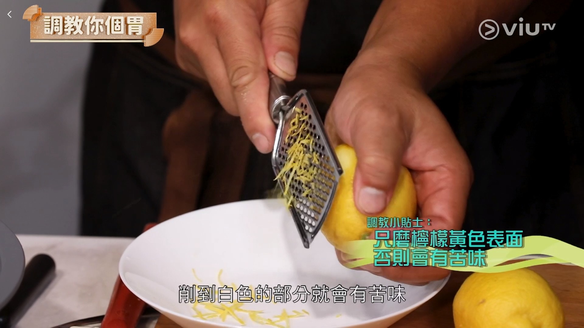 此時,可以刨檸檬皮。【小貼士3】檸檬皮很香,值得保留,但要注意只取黃色表皮,白色的部分會帶苦,宜避開。(ViuTV《今晚趁熱食》節目截圖)
