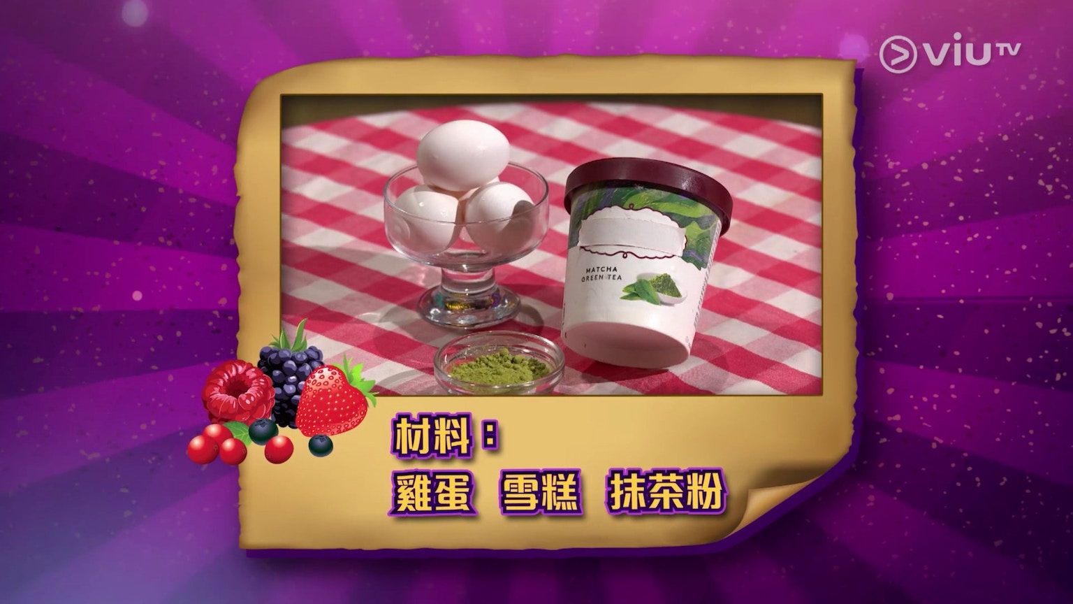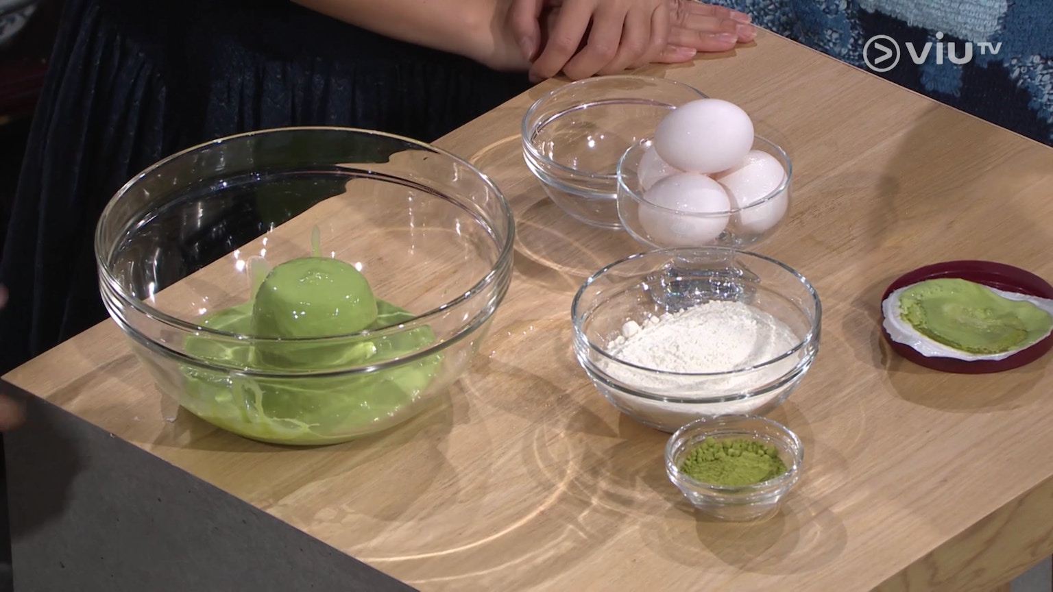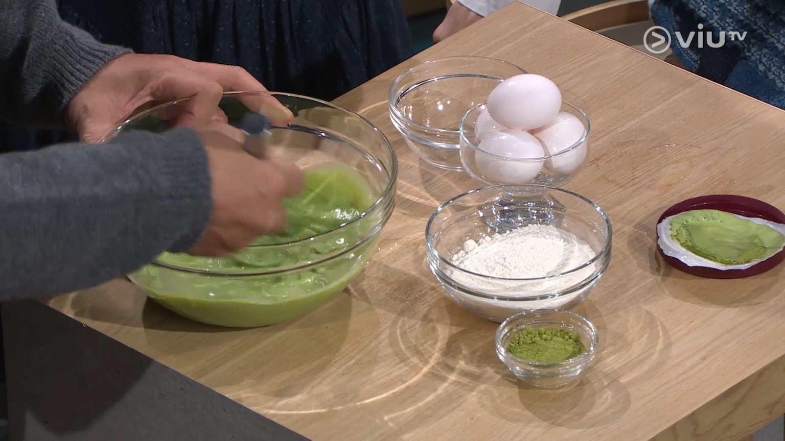 冰火蛋糕僅需4種材料,有抹茶雪糕、抹茶粉、自發粉與雞蛋。(ViuTV《晚吹 - 空肚講宵夜》節目截圖)